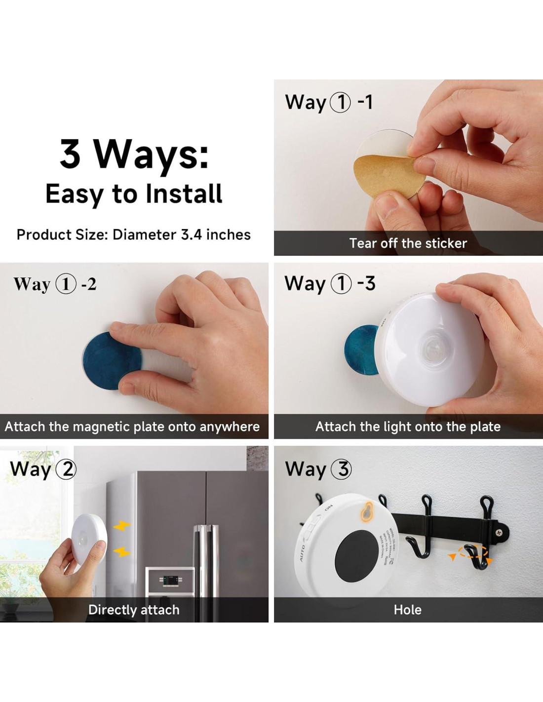 - FÁCIL DE INSTALAR: Mejora del imán y adhesivo incorporados. Luz sin cableado, se adhiere magnéticamente en cualquier lugar. Hay 3 formas de instalar, adjuntar directamente a cualquier metal, adjuntar a la placa magnética, o colgar a través del orificio en la parte posterior. * LO QUE OBTIENE (Por paquete): 1 luz LED, 1 placa magnética, 1 cable de carga USB. * Tamaño del producto: Diámetro 8.6 cm.