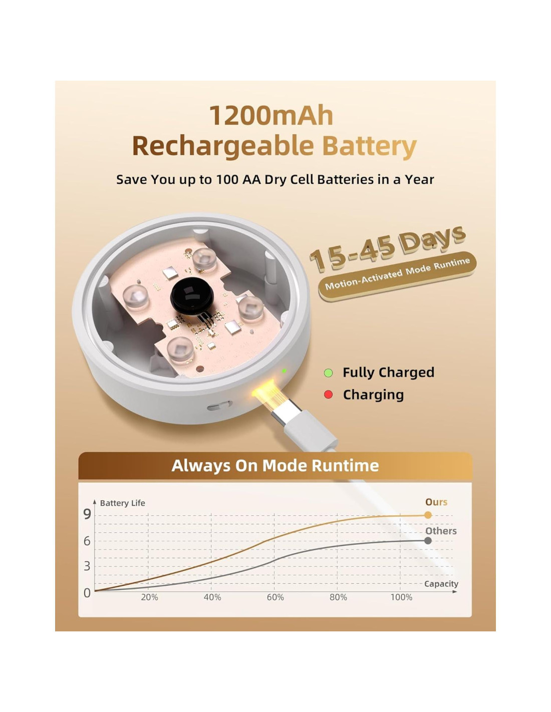 - [Recargable y Ahorro de Energía] -- La batería recargable de 1200mAh puede durar de 30 a 60 días con una frecuencia de iluminación de 10 a 20 veces diarias durante 20 segundos cada una en modo AUTO, y puede permanecer iluminada durante 11 horas siempre que esté en un temporizador. Súper conveniente y ahorrando hasta 100 baterías AA por año por luz. (Nota: Por favor, carga antes del primer uso.)