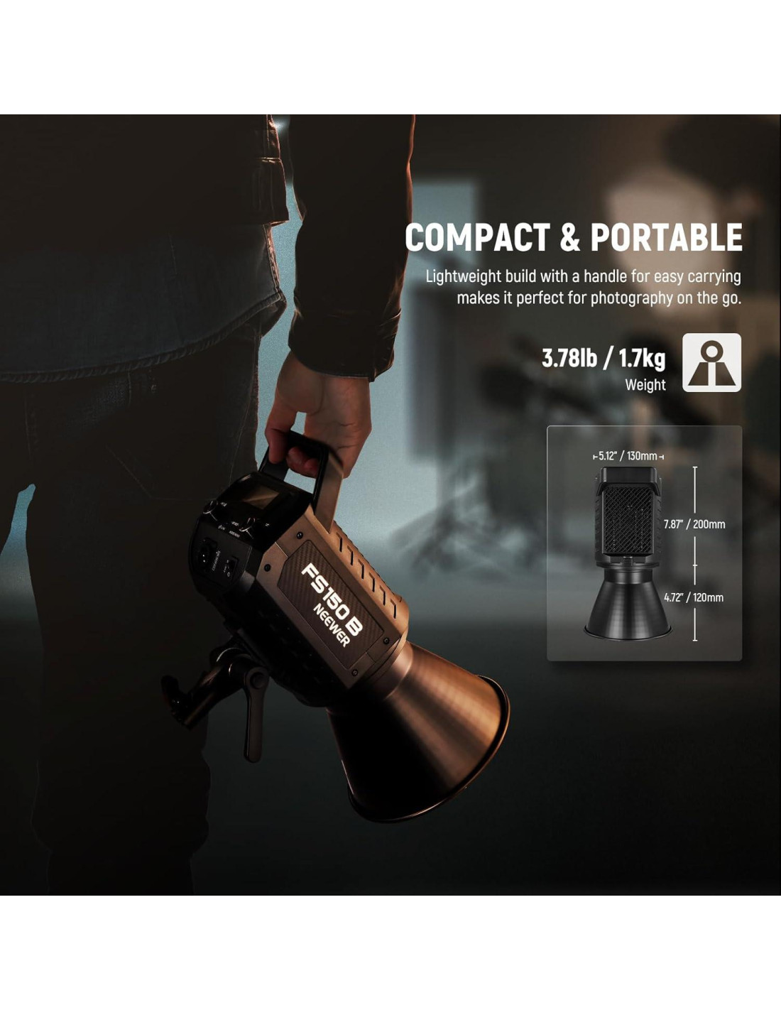 - [130W Luz de Estudio Compacta Poderosa] NEEWER FS150B utiliza LEDs COB premium y eficientes para un brillo excepcional, salida de 130W sin parpadeos, y 72000lux a 1m de iluminancia máxima. El foco portátil pesa 3.8lb (1.7kg), mide 7.9"x5.1"x4.7" (200x130x120mm), con un adaptador de soporte de montaje inclinable de 180 para configuraciones de ángulo libre. Kit de fotografía ideal para retratos, fotos de cámara, entrevistas, videografía de podcast, grabación de video, filmación, iluminación clave de transmisión en vivo y sesión fotográfica de estudio