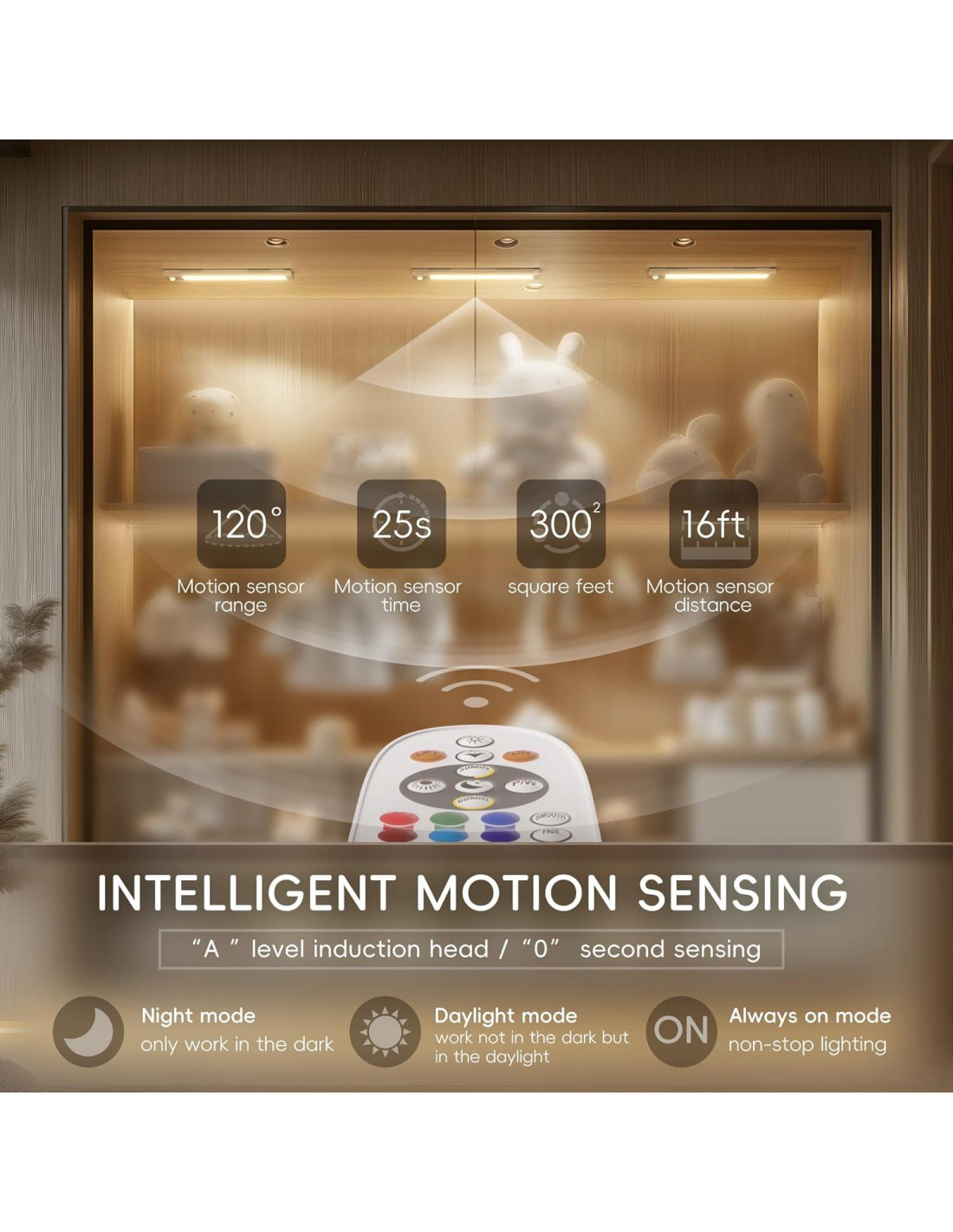 - [Luces Bajo Gabinete Inteligentes Mejoradas con Control a Distancia] Cada luz con sensor de movimiento interior mide 19.7 cm x 4 cm x 1.3 cm y pesa solo 92g, lo que la hace muy elegante y ligera. La luz de armario cuenta con 24 LEDs blancos, 24 LEDs cálidos y 12 LEDs RGB, totalizando 60 perlas energéticamente eficientes y no deslumbrantes que protegen tus ojos. Puedes usar el control a distancia para establecer tu color preferido. Ideal para usar como iluminación bajo gabinete, iluminación de armario, iluminación de pasillo y como iluminación ambiental, así como luz de barra LED RGB para decoración del hogar o fiestas.