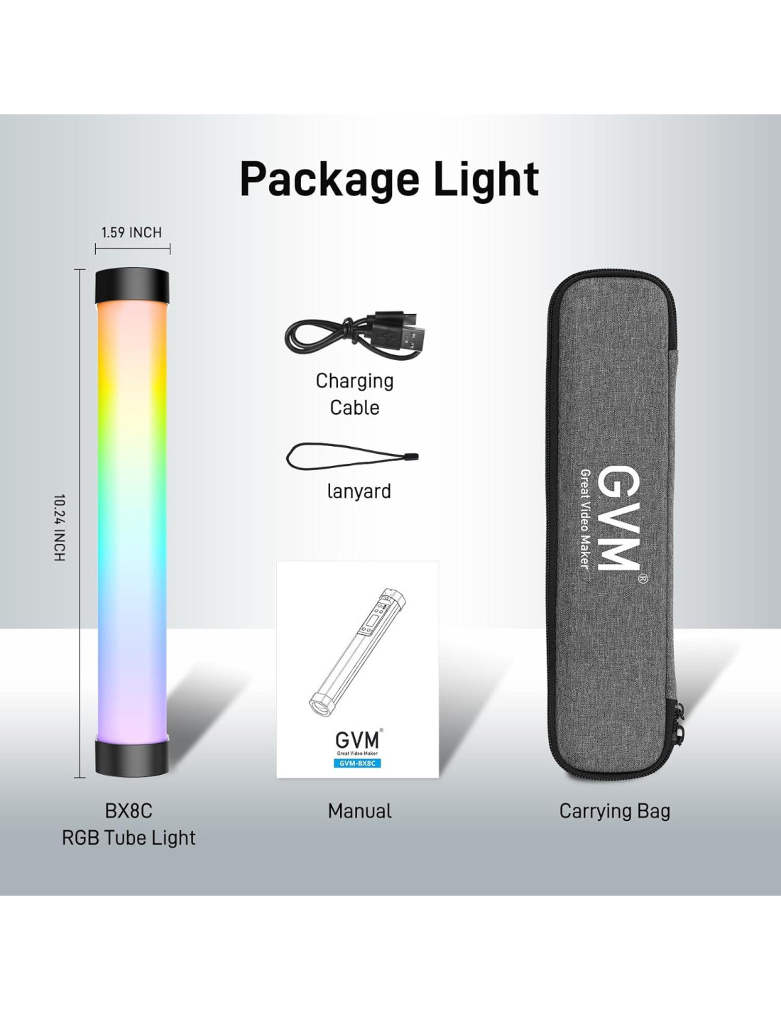 - Batería Recargable para Portabilidad La luz de tubo RGB GVM BX8C pesa 104.3 g y mide 4.1 cm x 25.9 cm, lo que es portátil y perfecto como luz de video LED de mano. La fuente de luz lineal presenta un ángulo de haz de 180 grados y una apariencia exquisita que puede funcionar como luz de estilo. La potente batería integrada de 3300mAh ofrece una duración de batería de 120 minutos a plena potencia, y un cable de carga incluido admite la carga mientras se usa.