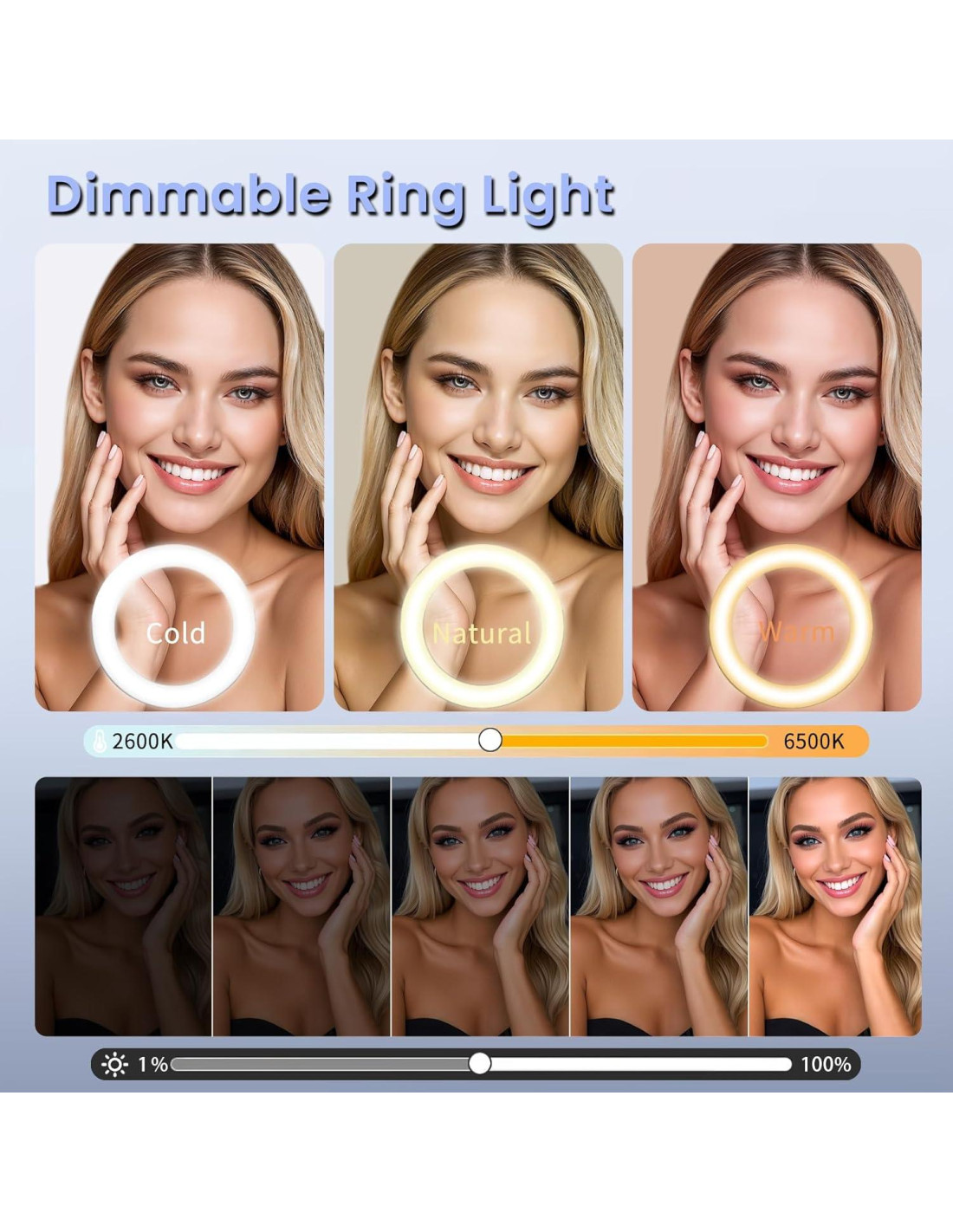 - [Pantalla LCD y luz de anillo regulable] Esta gran luz de anillo para tabletas compatible con iPad y iPhone, cuenta con una pantalla LCD que muestra intuitivamente el brillo y la temperatura del color, facilitando el ajuste al modo de iluminación deseado. La luz de anillo de 22 pulgadas con soporte ofrece un brillo ajustable del 1% al 100%, y una temperatura de color personalizable que varía de amarillo cálido a blanco frío (3000K-4500K-6500K). Permite a los usuarios ajustar la iluminación óptima para varios escenarios, siendo ideal para fotografía de retratos, transmisión en vivo y trabajo al aire libre.