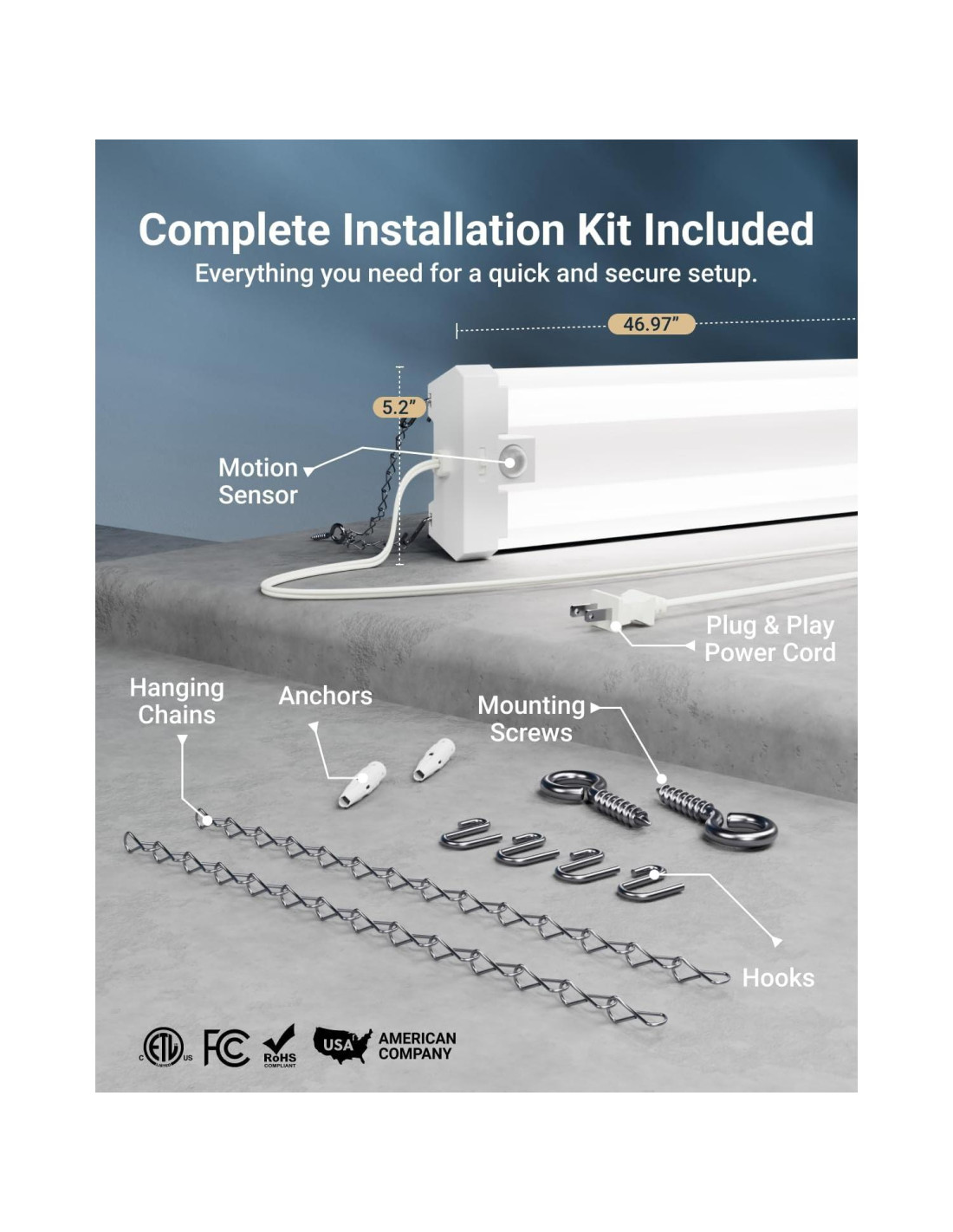 - ENLAZABLE - Conecta en cadena hasta 4 luces de taller LED para ahorrar energía. Monta directamente o suspende con la cadena incluida para una luz brillante e instantánea en cualquier espacio.
