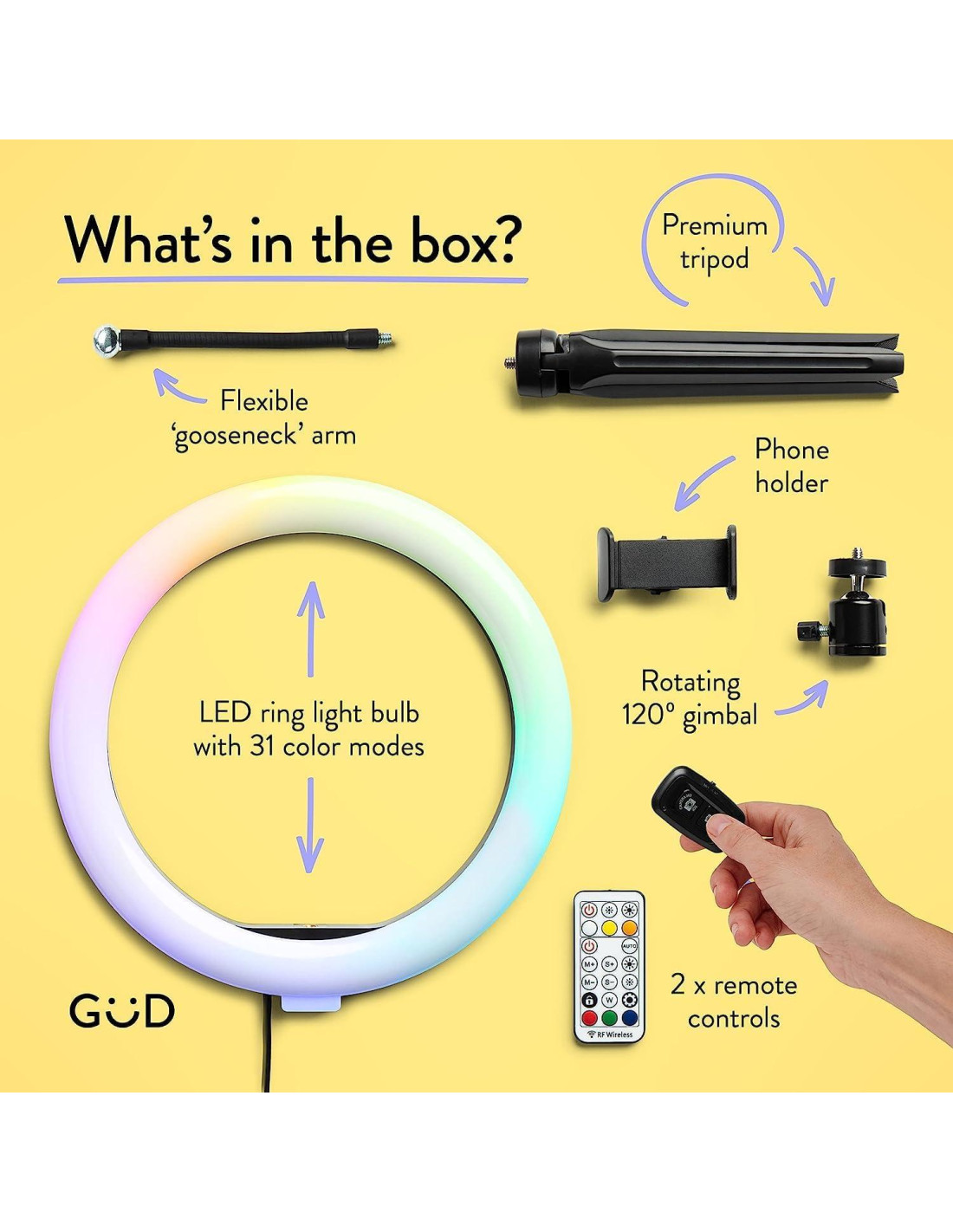 Nuestra Luz de Anillo no podría ser más fácil de configurar y usar en cualquier lugar. Perfecta para el creador en movimiento así como para el streamer en casa más experimentado. La superior gama de modos de color RGB (16 dinámicos, 15 estáticos) significa que puedes lograr el aspecto que desees para que tu contenido brille. Nuestro único soporte de teléfono flexible 'gooseneck' te permite tomar la selfie perfecta desde cualquier ángulo.