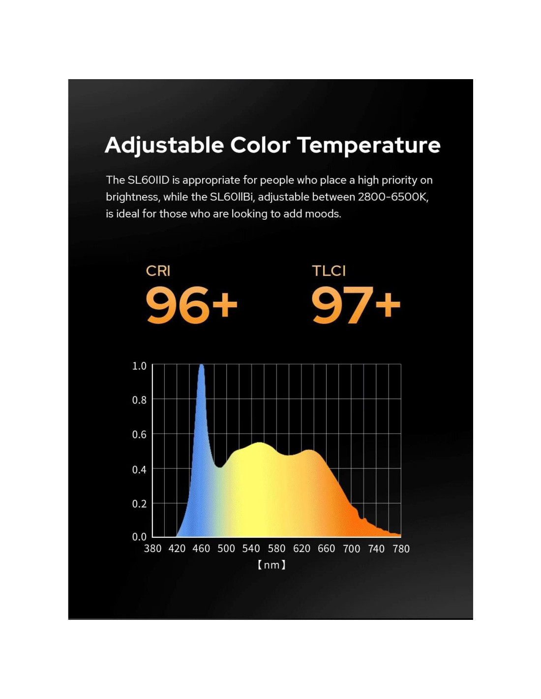 - [Temperatura de Color Ajustable] - El SL60IID es apropiado para personas que dan alta prioridad al brillo, mientras que el SL60IIBi, ajustable entre 2800-6500K, es ideal para aquellos que buscan añadir ambientes. El nuevo SL60II-Bi también resuelve el problema de la temperatura de color única del SL-60W. Satisface más necesidades.