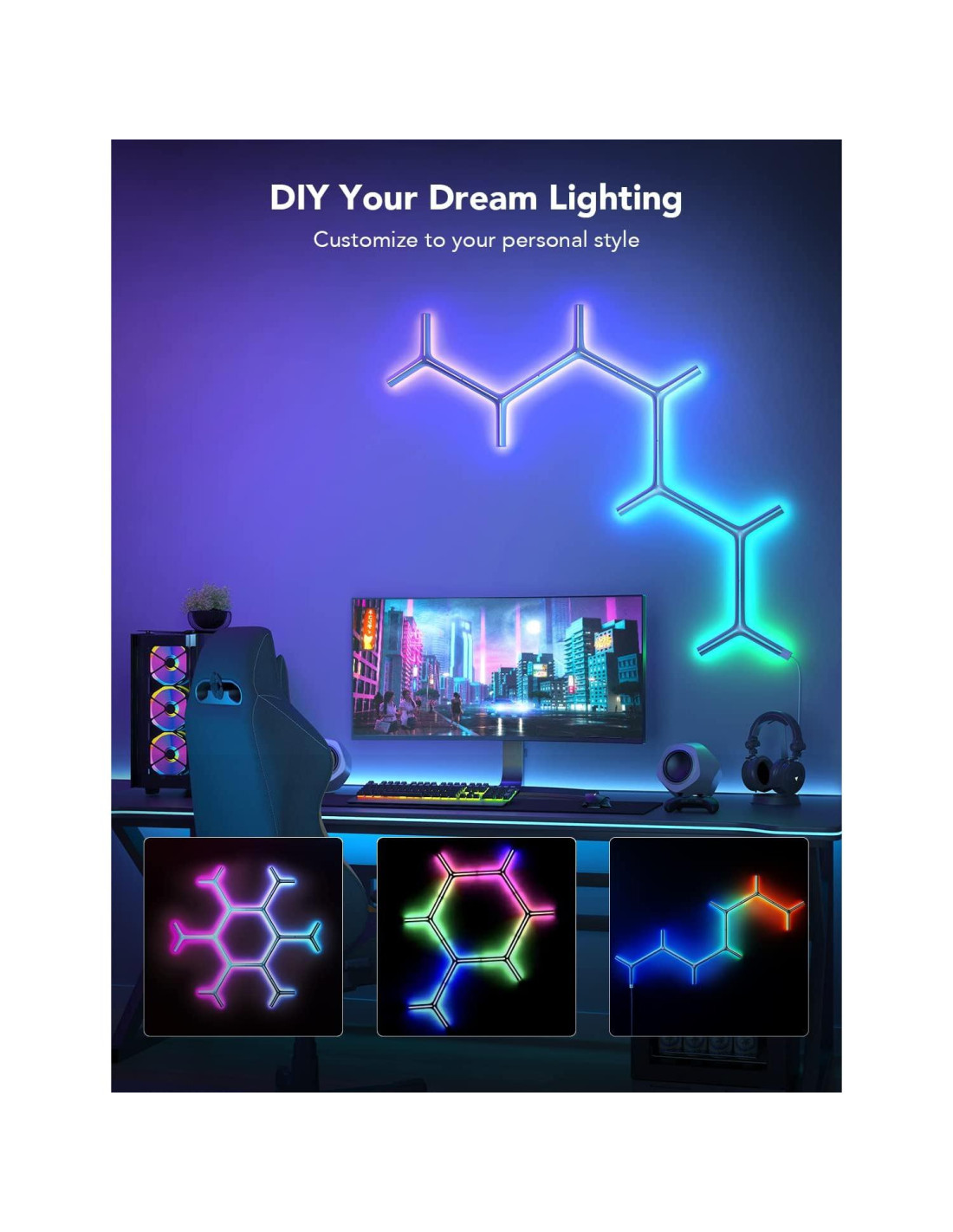 - Arte por Diseño: Donde lo moderno se encuentra con lo futurista, nuestras luces de juego combinan metal y plástico para crear hermosas decoraciones en tus paredes. Crea un diseño que se sienta como una obra de arte que puedes crear tú mismo.