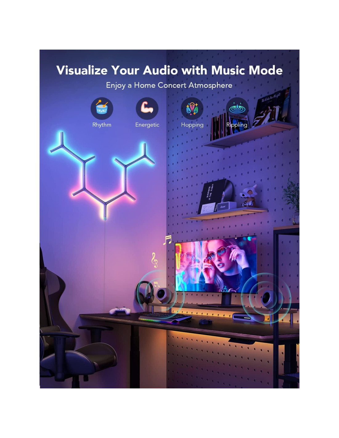 - Más de 40 Modos de Escena Hermosos: Elige entre una variedad de modos de escena para adaptarse a la atmósfera cambiante en tu sala de juegos, dormitorio y sala de estar.