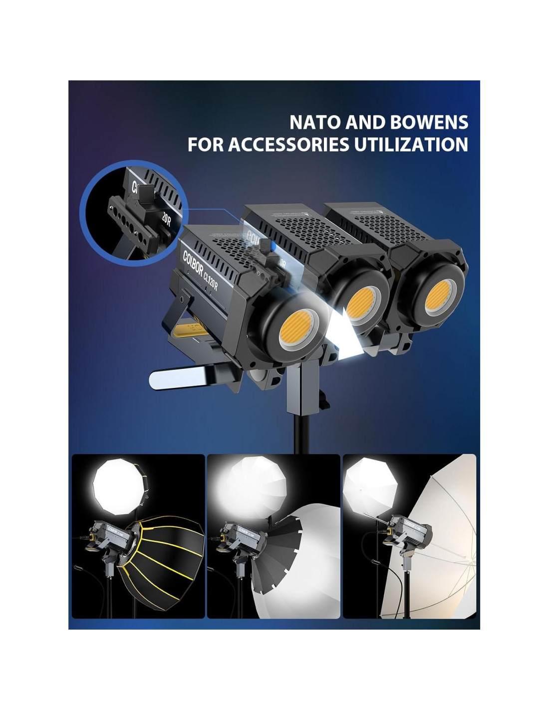 - Control de Iluminación de Estudio a través de un Sistema de Control Flexible Optimiza tu flujo de trabajo de configuración de luces con la APP de COLBOR Studio y su sistema de control inalámbrico. La función de configuración de múltiples escenas optimiza el proceso para diferentes aplicaciones de grabación, haciendo que tu trabajo de configuración de luces sea un 60% más rápido. Con la Red Mesh y el canal de 2.4GHz, puedes controlar las luces de forma remota a través de la app o un control remoto.