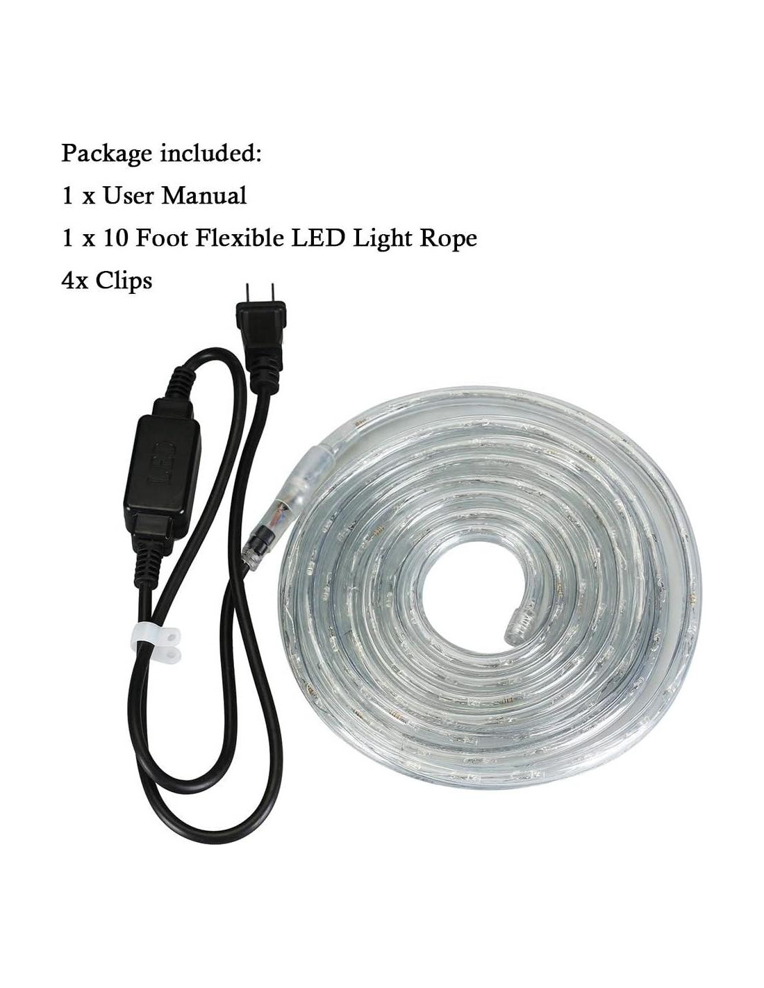 Nuestras luces de cuerda LED son ideales para decorar escaleras, barandillas, techos, escritorios, ventanas, barcos, clubes, fiestas, galerías y días festivos especiales. Estas luces de cuerda LED están encapsuladas en un tubo de PVC altamente flexible. Características adecuadas para decorar escaleras, barandillas, techos, escritorios, ventanas, barcos, clubes, fiestas, galerías y días festivos especiales. La estructura es simple, clara, instalación conveniente, rentable. Ahorro de energía y mayor vida útil. Tubo de PVC cristalino para un uso duradero y más brillante. Fácil de doblar en cualquier forma. Luz saludable, sin radiación, sin contaminación. Protección de la vista, alimentación de corriente continua, evita parpadeos frecuentes que pueden causar daño ocular. Alta flexibilidad, sostenibilidad a temperaturas y resistencia a UV. Especificaciones de 10 pies: Color: blanco cálido/blanco frío. Longitud total: 10 pies (3.05 metros). Bombillas LED: 108. Diámetro del tubo: 12 mm. Ángulo del haz: 45. Cantidad de LED: 36 LED/m. Paquete incluido: 1 x cuerda de luz LED flexible de 10 pies, 4 clips. Por favor, tenga en cuenta: solo las tiras LED son impermeables y los conectores no son impermeables.