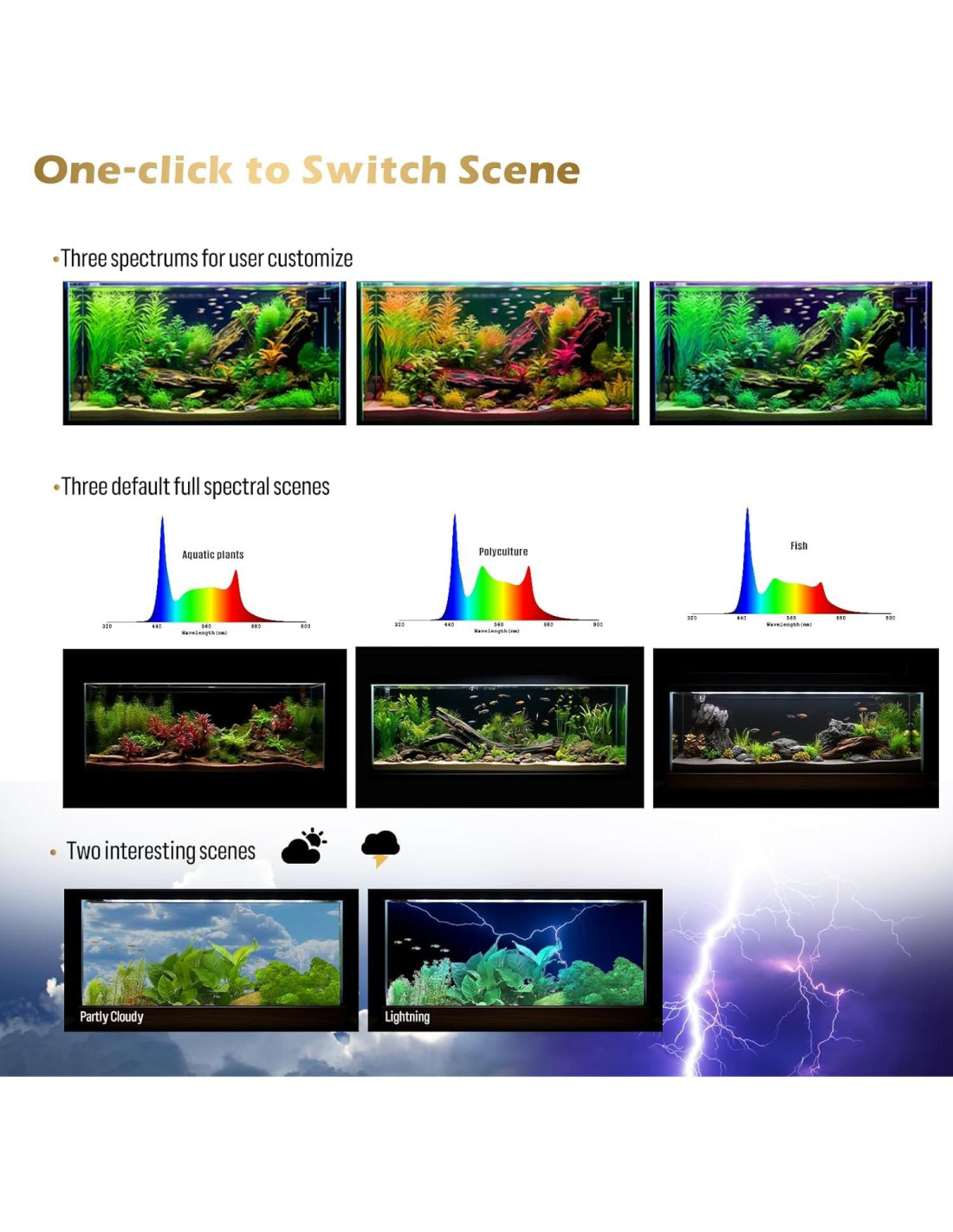 - Espectro Múltiple Preestablecido Luz de acuario con tres escenas espectrales predeterminadas y dos escenas interesantes, proporciona opciones flexibles para un uso diario fácil y una forma conveniente de crear el color mejorado para la acuascaping. Esto asegura que tus plantas acuáticas y peces obtengan la mejor iluminación y salud.