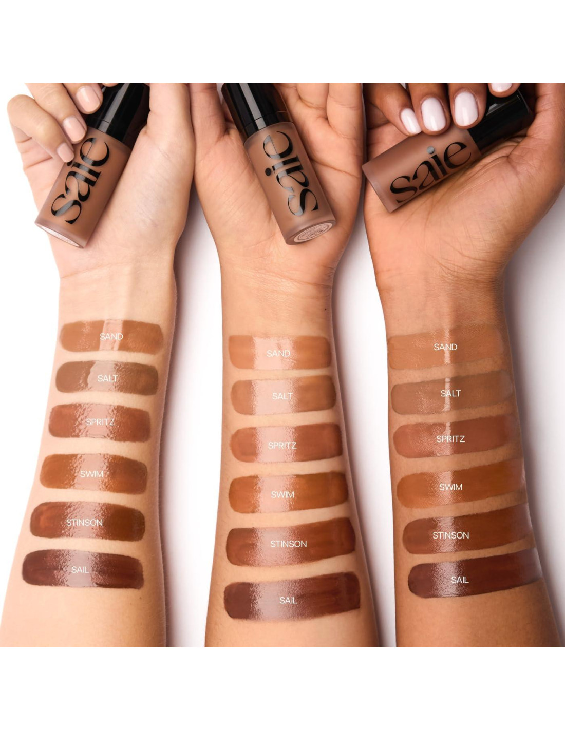- Duo Brillante - Este conjunto incluye el Bronceador Líquido Suave Dew Bronze de Saie y el Mini Gel Iluminador Ligero Brillante, combinándose para crear un cutis luminoso y besado por el sol con beneficios hidratantes.