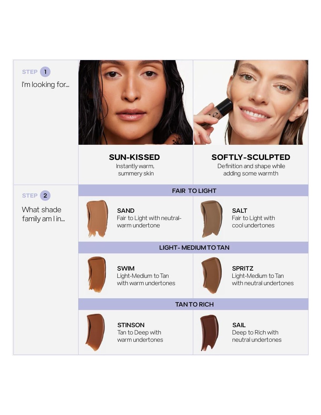 - Bronceador Líquido Dew Bronze - Un bronceador ligero y mezclable que se funde en la piel, ofreciendo un rubor uniforme de color bronceado sin rayas ni acumulaciones, enriquecido con ingredientes hidratantes e iluminadores.
