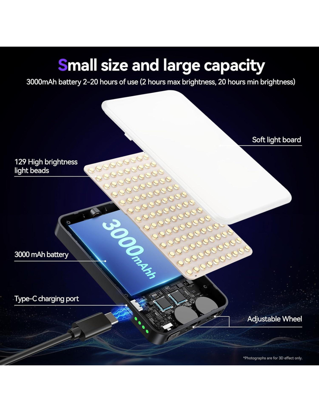 - [Tamaño pequeño y gran capacidad] Luz brillante de selfie portátil mini, batería incorporada de 3000 mAh, 10 modos de iluminación con vida útil efectiva de 2-20 horas, puede satisfacer el entorno oscuro de selfies, luz de relleno para fotografía de alimentos, luz de relleno para maquillaje, luz de relleno para reuniones temporales, luz de relleno en vivo al aire libre, modelado de atmósfera RGB colorido para añadir diversión a la fiesta, etc.