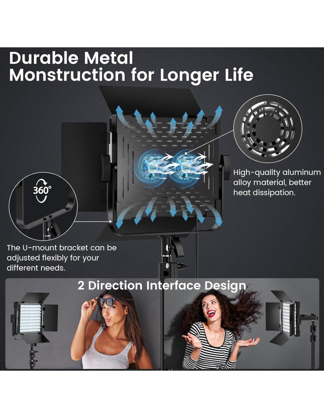 - [Iluminación Rotativa de 360] Disfruta de una flexibilidad de iluminación excepcional con el soporte en forma de U rotatable 360, la iluminación fotográfica permite un giro sin esfuerzo de su panel, asegurando un ángulo óptimo para tu visión creativa. Además, la puerta de granero de metal de cuatro piezas proporciona una adecuada modelación de la luz y control de derrames, empoderándote para lograr resultados de calidad profesional con facilidad.