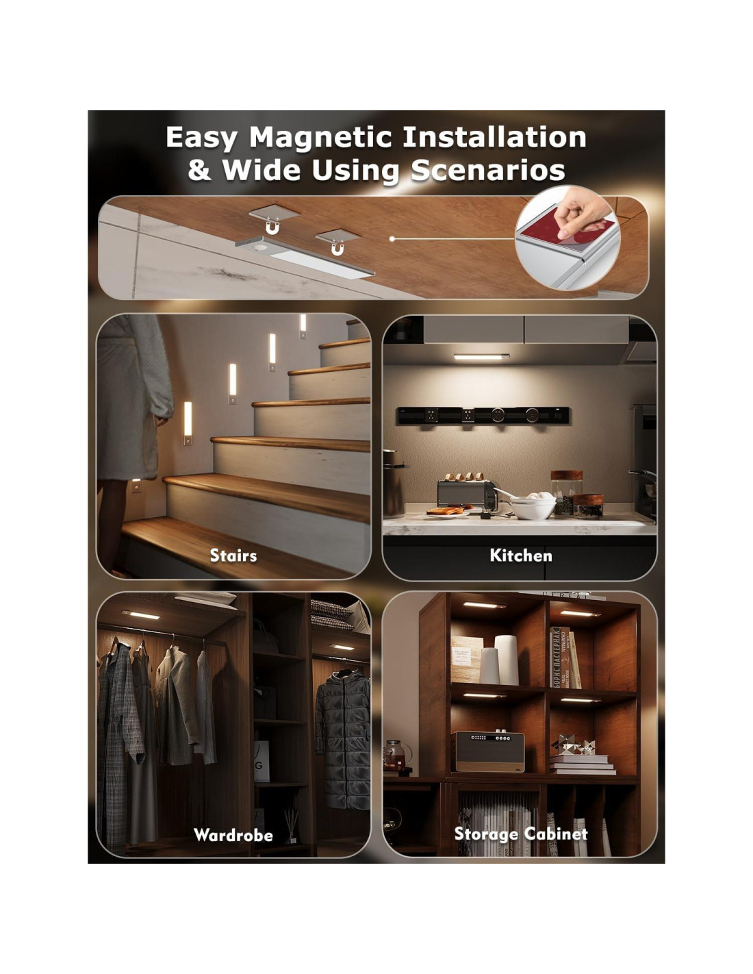 - [2 Métodos de Instalación Cordless Removible] - La luz de armario activada por movimiento tiene imanes incorporados y accesorios de hierro adhesivos, con los cuales el cuerpo de luz ultra delgado de 0.84 cm (0.33 pulgadas) es fácil de sostener en cualquier superficie no metálica. También, para la fijación directa a superficies metálicas magnéticas. Las luces luminosas para gabinetes bajo el mostrador también se pueden quitar fácilmente para necesidades de iluminación temporal, recarga o reubicación.