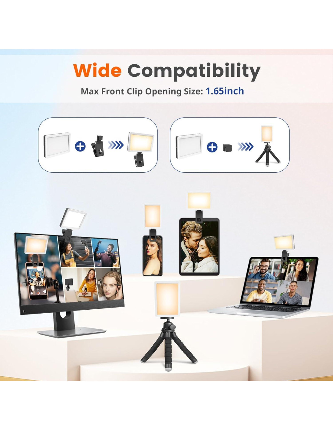 - Lo Que Obtienes: 1*Luz de Relleno; 1*Clip Frontal; 1*Conector de 1/4; 1*Cable de Carga Type-C. Para cualquier pregunta o problema, contacta a nuestro servicio al cliente, estamos aquí para ayudar