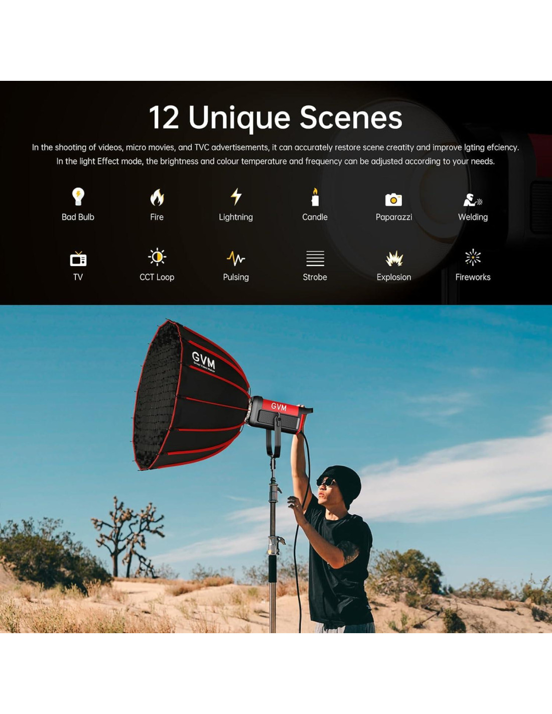GVM-PRO-SD300B proporciona modo de control DMX con precisión de 8 bits y 16 bits. Soporta control de panel, que puede ajustar suavemente parámetros como brillo, temperatura de color, compensación de rojo y verde, color y efecto de luz. Cada perla COB está equipada con una lente óptica para hacer la luz más uniforme, soporta 4 tipos de curvas de atenuación. Ventilador ultra silencioso incorporado, te proporciona un ambiente de grabación silencioso. Este foco de video tiene una construcción sólida de aluminio que puede soportar el bullicio del uso intensivo diario. Totalmente compatible con otros equipos de fotografía para un control máximo sobre el efecto de luz suave. Cada perla COB está equipada con una lente óptica para hacer la luz más uniforme y eliminar impurezas, mientras mejora el brillo de la perla. El foco de estudio se puede almacenar en la caja de envío, protege eficazmente el cuerpo de la luz y los accesorios para un transporte fácil y un almacenamiento seguro.