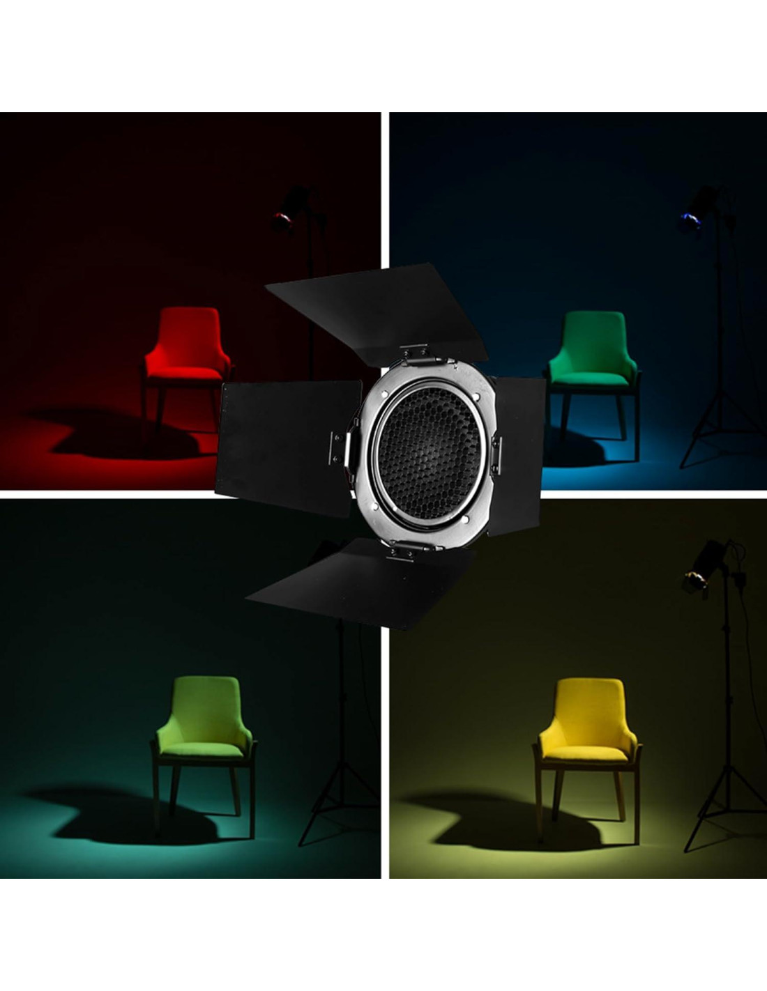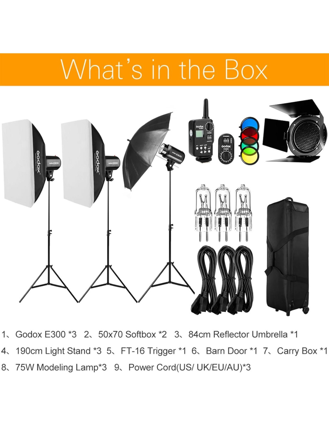 - Kit de Iluminación Fotográfica: E300 300W Monolights*3, Caja Suave de 20" x 27" *2, Soportes de Luz de 190 cm *3, cable de alimentación *3, 1x conjunto de disparador FT-16, paraguas reflector de 33" (84 cm) *1, Puerta de Granero BD-03 *1, Caja de Barra Deslizante *1, la función de reflash permite la sincronización con cámaras que tienen un sistema de disparo de un pre-flash.