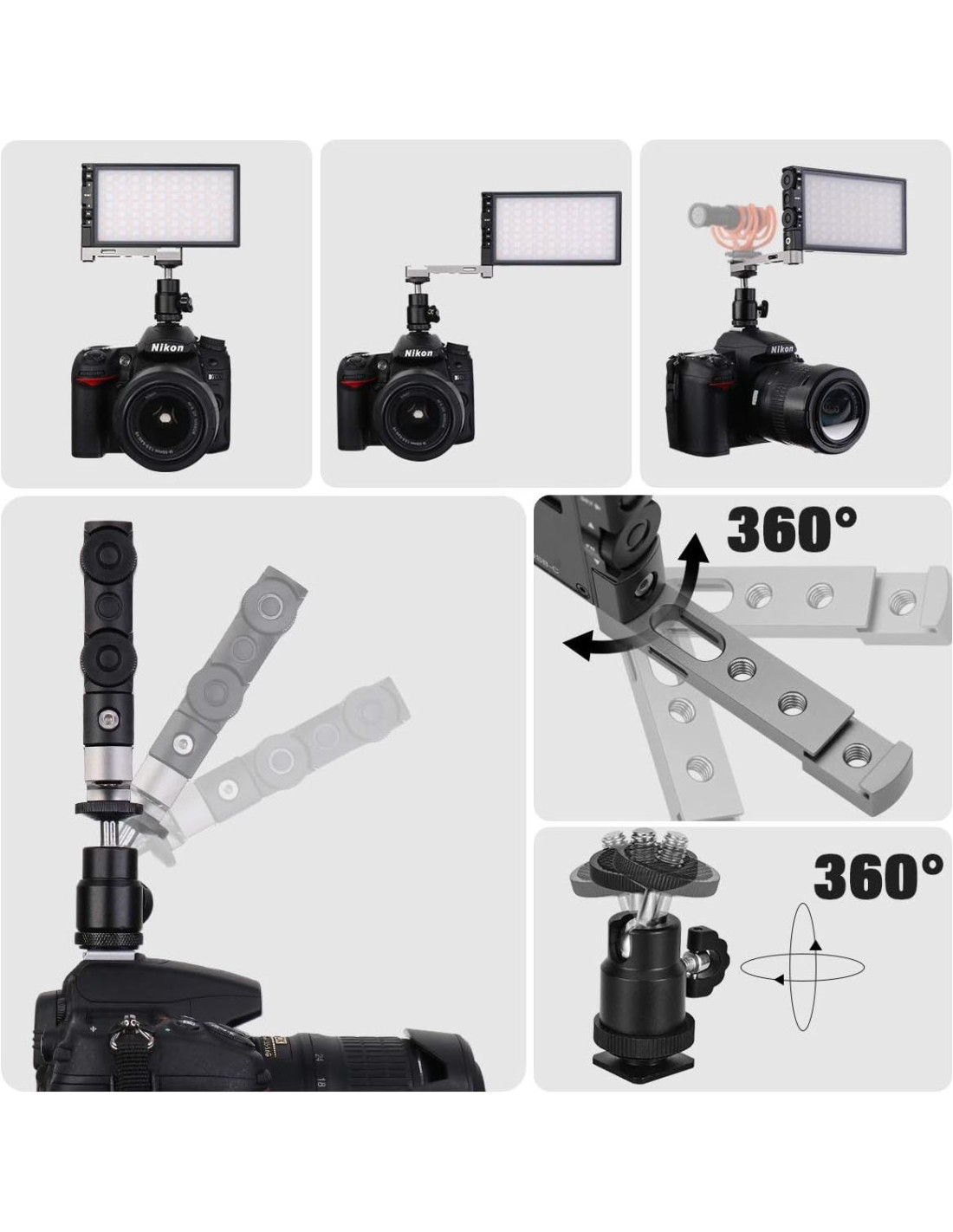 - [BRAZO GIRATORIO CON ZAPATA FRÍA] Nuestra luz de panel LED equipada con un brazo giratorio de 360 grados con zapata fría permite que puedas montar cualquier dispositivo con adaptador de zapata caliente simultáneamente, como micrófono de cámara, perfecto para grabación.