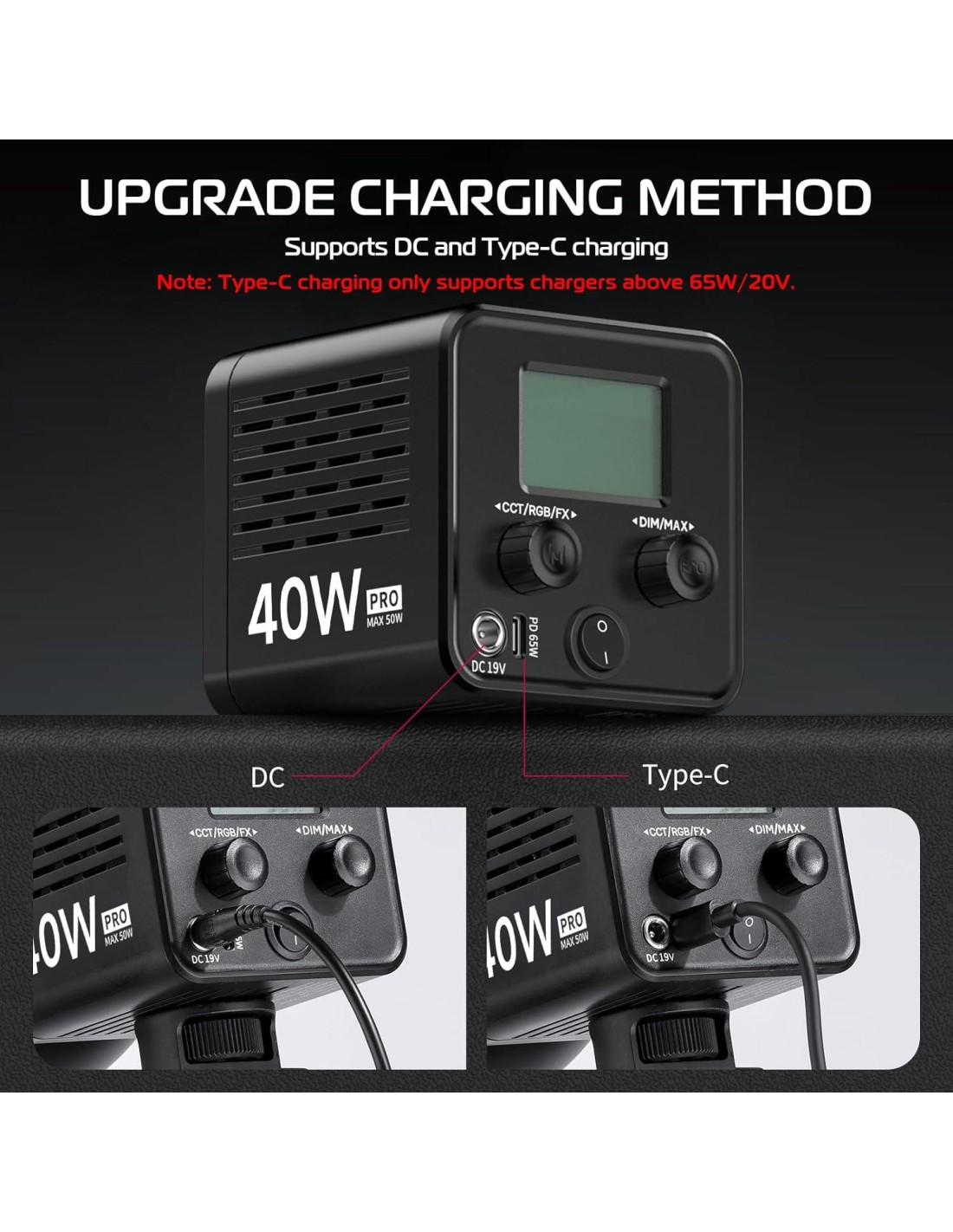 - Nuevo 40W PRO La luz LED para video mejorada con un nuevo puerto de carga TYPE-C, que se puede conectar a un banco de energía externo y se puede cargar completamente en 3 horas. (Solo admite cargadores Type C de más de 65W/20V)