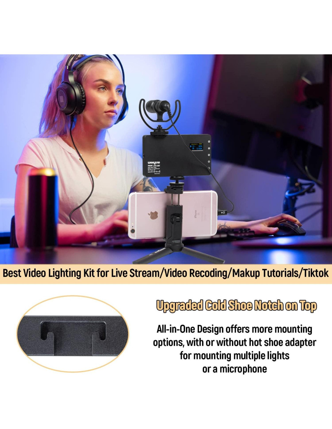 - Temperatura de color 2500-8500k & color completo 360 La panel LED tiene 28 bombillas de alto CRI 95+ (bicolor) y 24 bombillas RGB, la temperatura de color es ajustable de 2500K (color cálido) a 8500K (color frío), y el color puede ser ajustable de 0 a 360, el brillo es ajustable del 10% al 100%, ampliamente utilizado en selfies, películas visuales o videos, iluminación de estudio y iluminación para reuniones en línea, etc.