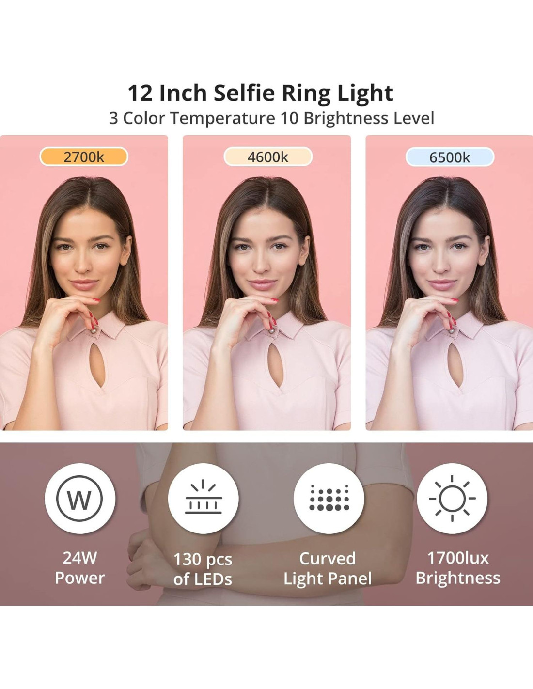 - [Luz de Anillo de 12 Pulgadas] Este kit de luz de anillo permite cambiar libremente entre escenas con diferentes condiciones de iluminación para transmisión en vivo/YouTube/vlogs/TikTok. Ajustable en 3 modos de color: frío (5800K-6500K), natural (4100K-4700K), cálido (2700K-3300K), con 10 niveles de brillo. El panel de luz curvado interno tiene 160 perlas de lámpara LED, ofreciendo 800lm de brillo. Puerto de carga tipo B USB en la parte posterior del panel de control táctil, recarga rápidamente tu celular, sin preocupaciones durante tu transmisión.