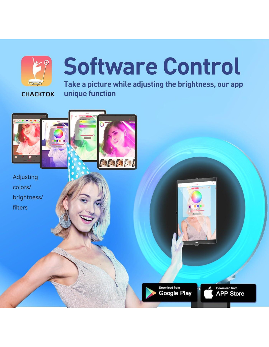 - [Función de Control de Software] Nuestro software proporciona servicios VIP gratuitos, permitiendo a los usuarios manipular colores de iluminación, aplicar filtros, agregar gráficos al tomar fotos. Además, se conecta sin problemas a impresoras para impresión de fotos en el lugar. Nuestro software también soporta una vista previa de iluminación RGB en tiempo real en la interfaz de captura de fotos, permitiendo a los usuarios identificar y seleccionar rápidamente sus preferencias de iluminación óptimas.