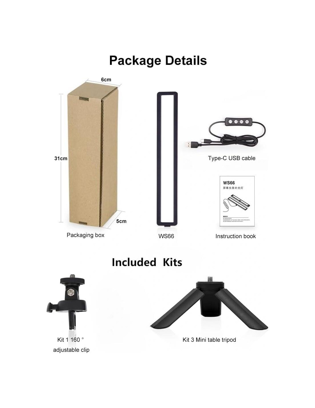 Información del Producto: Temperatura del Modo CCT: 2500K-9000K 1200K Perlas LED de Alta Brillo: 33 pcs Blancas + 33 pcs Amarillas Puerto de Carga: Tipo-C Voltaje de Trabajo: 5V / 2A Potencia: 9W Adecuado para Varios Escenarios: Iluminación para Laptop & Iluminación Educativa & Iluminación para Video & Iluminación Nocturna CRI: >95 Color: Negro Tamaño del Paquete: 31*5*6cm Peso Neto: 98g