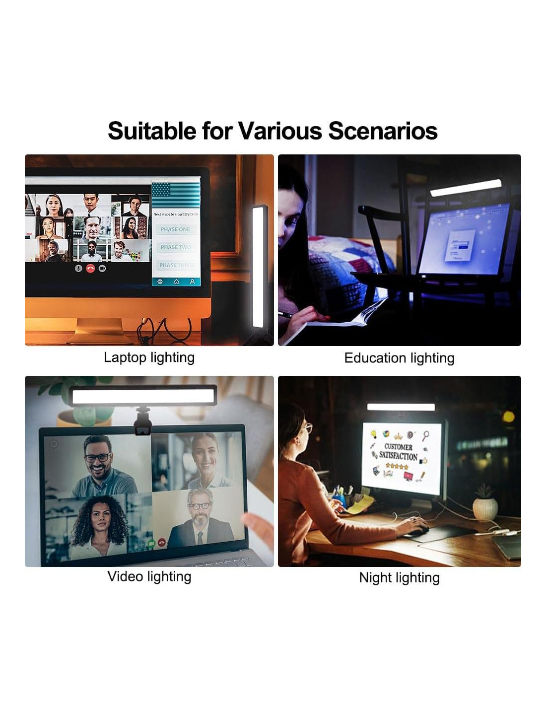 - Iluminación Multifuncional para Zoom de Computadora La luz para laptop para videoconferencias está diseñada para mejorar la iluminación de la pantalla de su computadora, proporcionando una iluminación suave y cómoda. No solo mejorará la calidad de sus videoconferencias, llamadas de Zoom, videos en streaming, llamadas de FaceTime y transmisiones, sino que también asegurará que siempre luzca lo mejor posible. Además, puede usarse como una lámpara de escritorio regular para la aplicación de maquillaje o como luz de lectura.