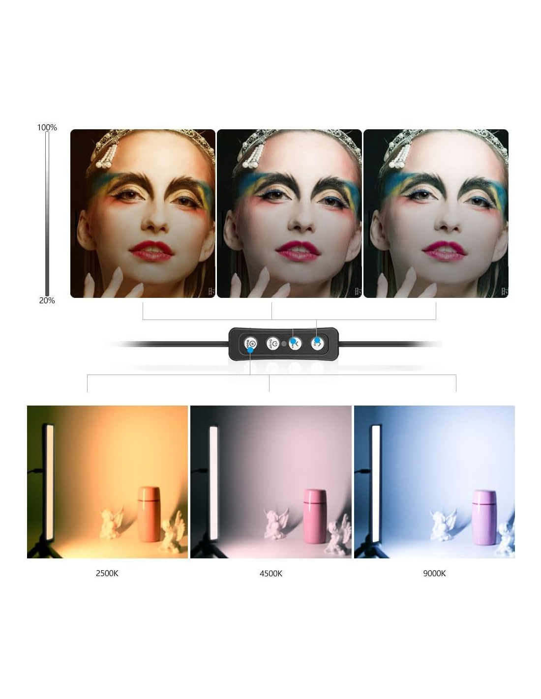- Tres Modos de Luz Ajustables La iluminación para zoom de computadora ofrece tres modos de temperatura de color ajustables: luz fría, natural y cálida, que varían de 2500K a 9000K. Cada modo tiene 11 niveles de brillo, permitiendo a los usuarios personalizar la iluminación según sus necesidades específicas y asegurar una visualización cómoda para sus ojos.