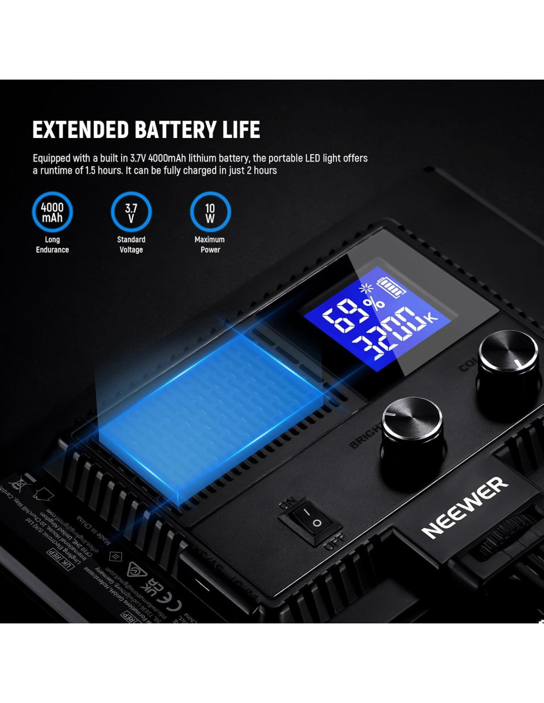 - [Kit de Panel de Luz LED para Video Versátil] El panel de luz LED de 9" cuenta con 58 LEDs cálidos y 58 fríos, ofreciendo una salida máxima de 10W con una iluminación máxima de 600lux (0.5m) y un CRI alto de 95+. Equipo de iluminación para grabación de video de podcast, retratos, sesiones fotográficas de estudio, fotografía de productos/comida, transmisiones en vivo, etc. Con un mini trípode para ajuste de altura, un adaptador de zapata fría para posicionamiento de ángulo, un cable USB y una batería de litio de 4000mAh incorporada para carga. Nota: La bolsa de transporte NO está incluida