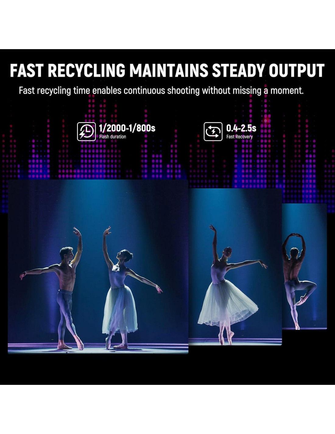 - Excelente Lámpara de Modelado de 150W Compacta pero capaz, la lámpara de modelado de 150W tiene 9 niveles de brillo (L1-L9) y ajuste de potencia de flash de 7.0-10 (1/8-1/1) para coincidir con las condiciones de luz ambiental reales. Duración de flash de 1/2000-1/800s y tiempo de reciclaje de 0.4-2.5s te ayudan a capturar cada momento precioso. El tubo de flash con una salida de potencia estable resiste altas temperaturas, alta tensión, deformación y rotura. La función de memoria guarda configuraciones para usar la próxima vez