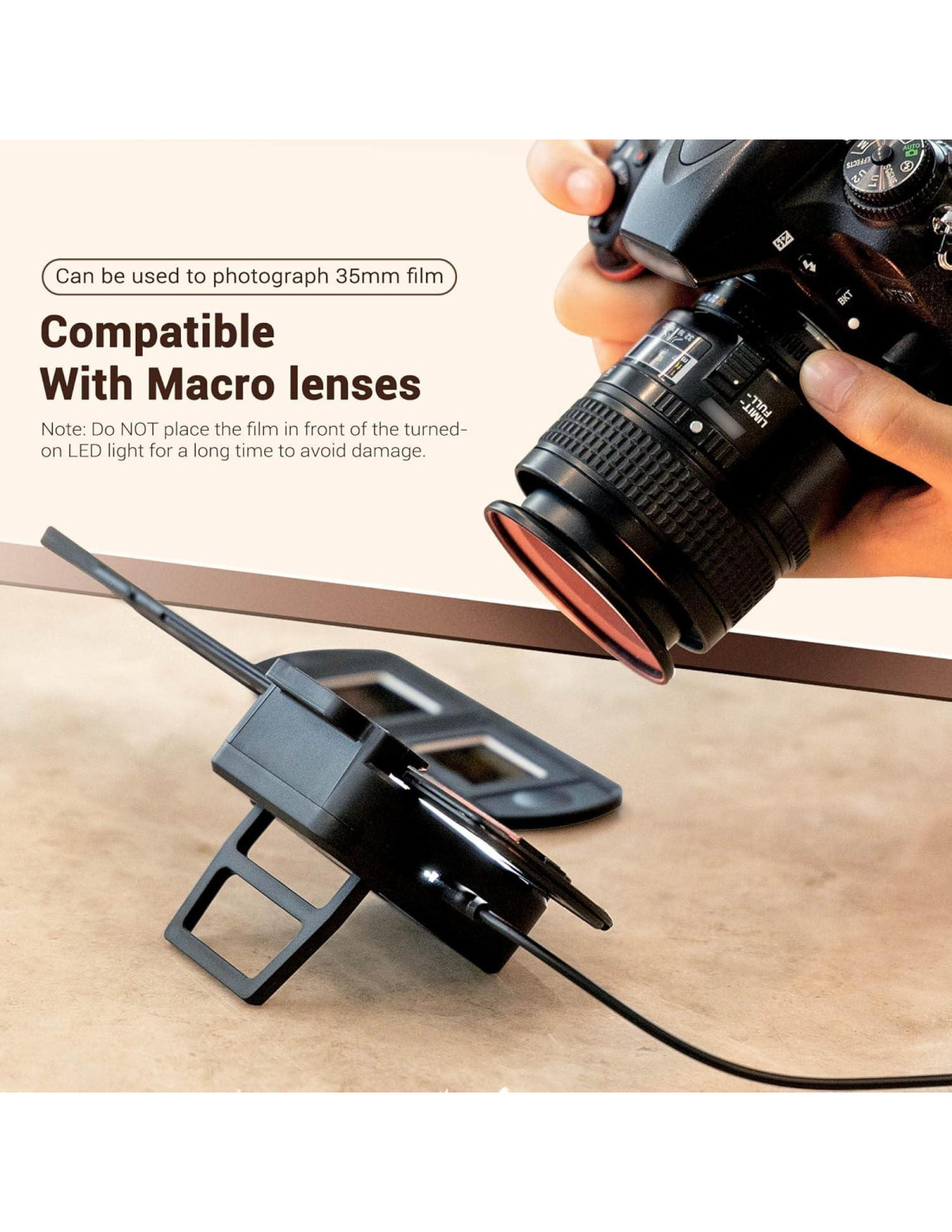 - El conjunto de luz convertidora de negativos tiene un diseño único para re-fotografiar negativos y diapositivas de 35mm con lentes macro. Crea buenas condiciones de fuente de luz al digitalizar película.