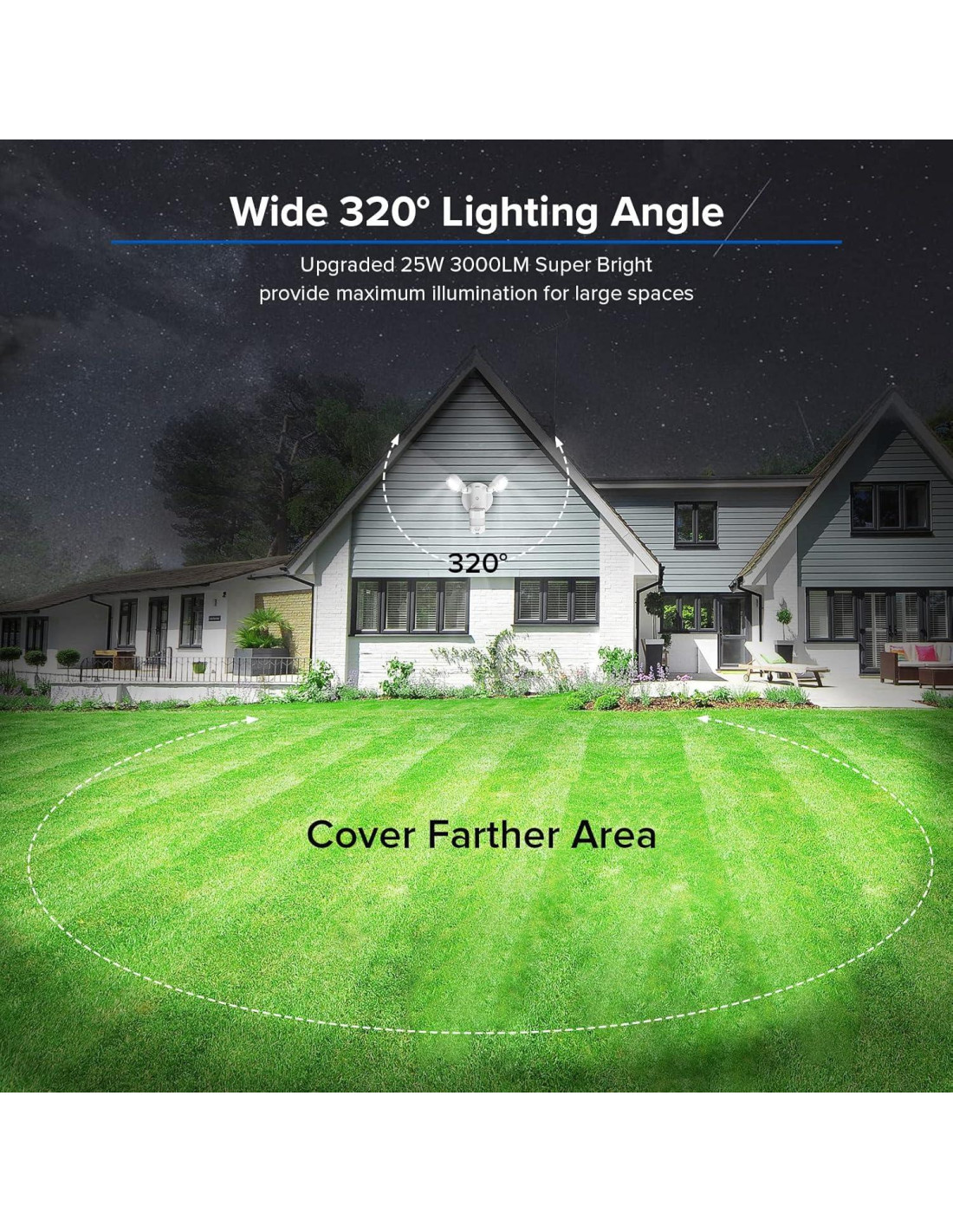 - ÁNGULO DE LUZ AMPLIO DE 320 Y FÁCIL INSTALACIÓN: El ángulo de luz puede tener una iluminación máxima de 320 grados. Puedes ajustar las 2 cabezas de luz de seguridad y la cabeza del sensor de movimiento a un ángulo diferente según tu requerimiento. Esta luz de seguridad por movimiento exterior se puede instalar para montaje en pared o montaje en soffit/alero siguiendo unos pocos pasos de cableado.