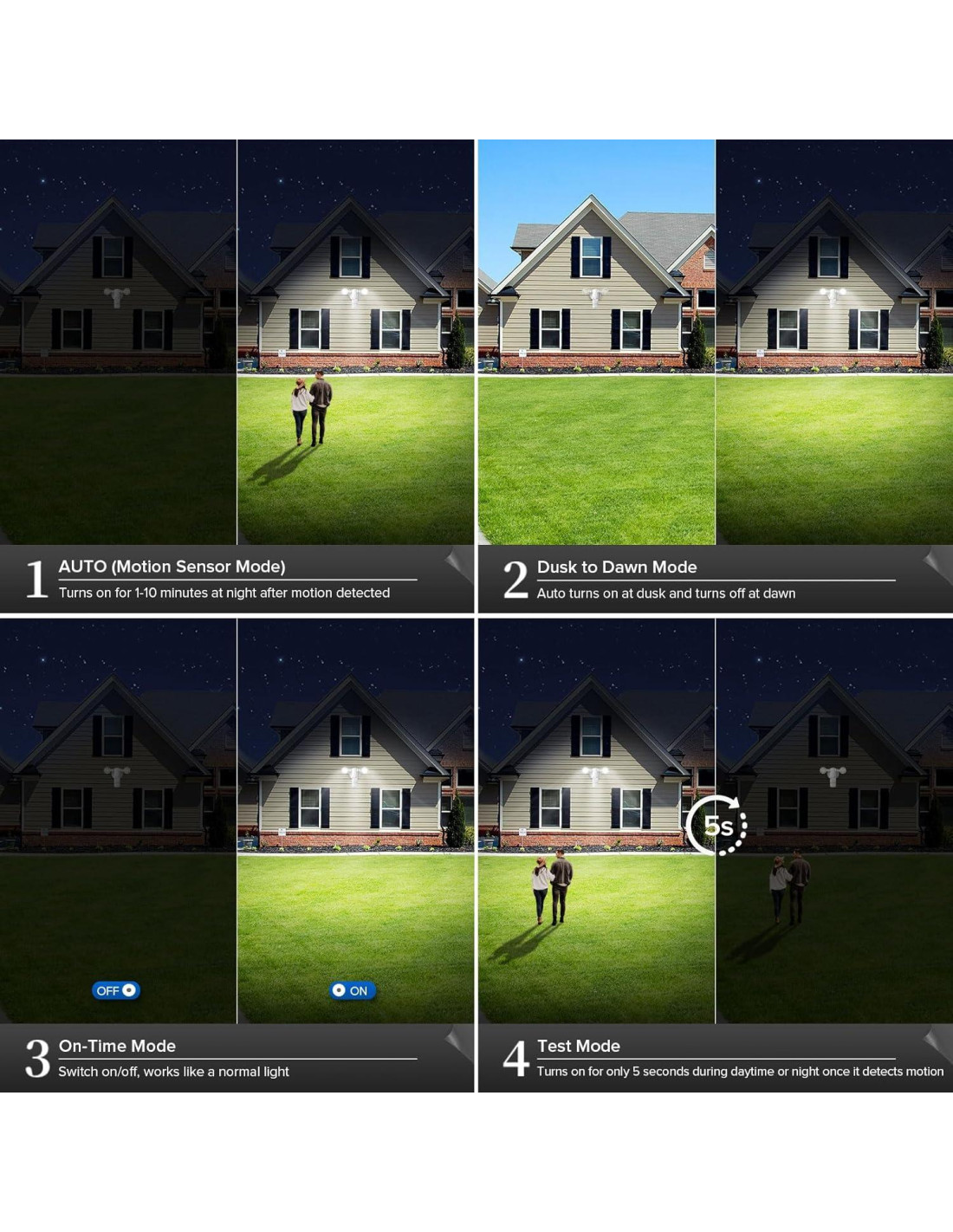 - CONTROL DE 4 MODOS: Con el modo de sensor de movimiento AUTO más utilizado, esta luz también proporciona 3 modos adicionales para diferentes demandas; Modo Dusk to Dawn: Se enciende automáticamente al anochecer y se apaga al amanecer; Modo On-Time: Control manual de luces que permanecen ENCENDIDAS mediante interruptor; Modo de Prueba: Detecta movimiento ambiental para encender la luz durante 5 segundos. Las luces de seguridad por movimiento pueden ser activadas por humanos en movimiento, coches o animales hasta 22 metros (72 pies) de rango de detección a un ángulo de detección de 180, el tiempo de iluminación se puede ajustar de 10s a 10mins; Mantén tu hogar seguro 24/7 y conveniente.