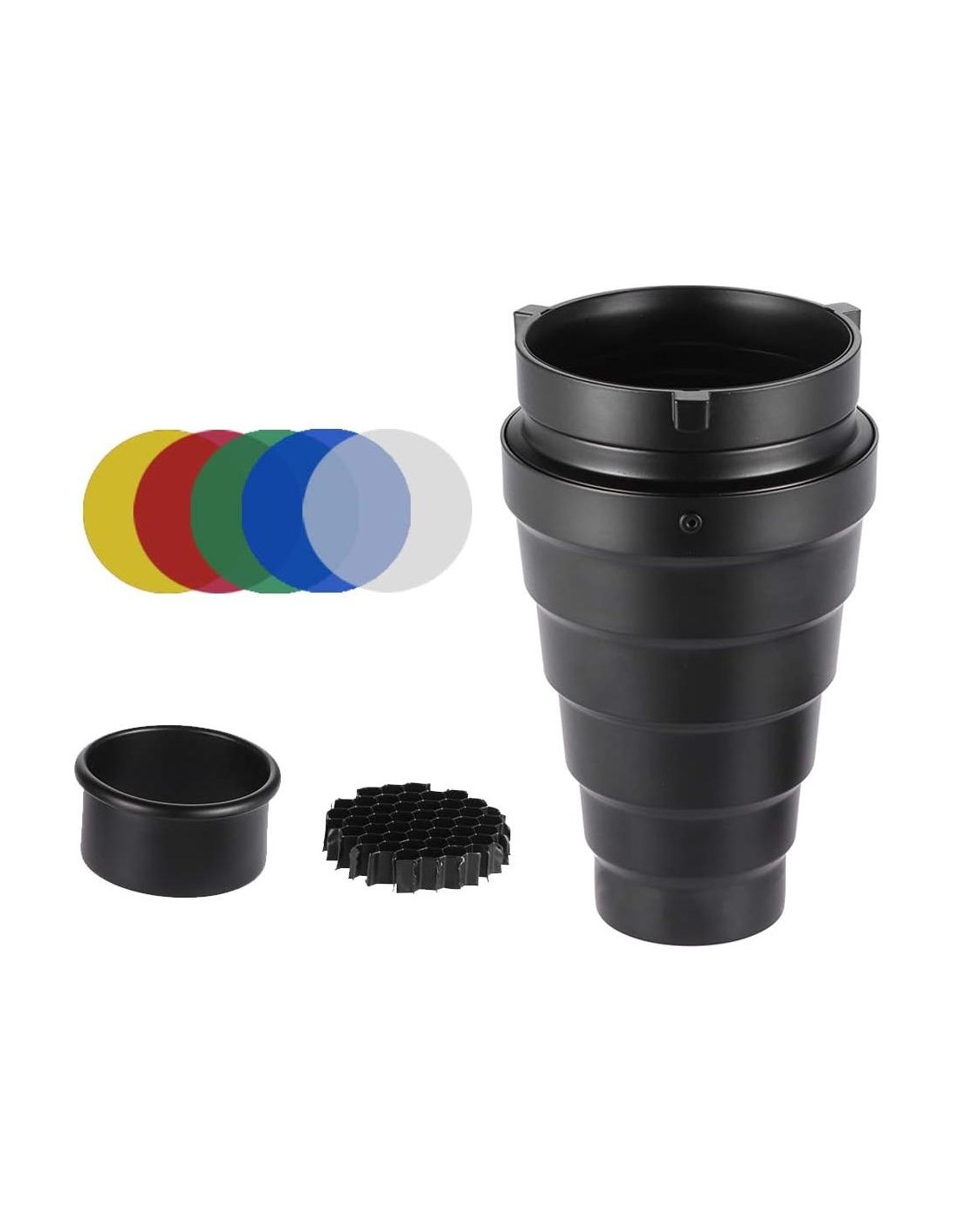 - El kit de snoot de luz fotográfica cónica bowens tiene cinco filtros de color (transparente, rojo, verde, azul y amarillo) que crean efectos a diferentes temperaturas de color.