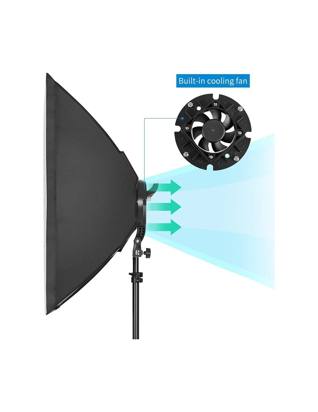 - Ventilador de Enfriamiento: El ventilador de enfriamiento incorporado del cabezal de luz LED, mejora la disipación de calor mientras está en funcionamiento, aumentando la vida útil del kit de iluminación softbox.