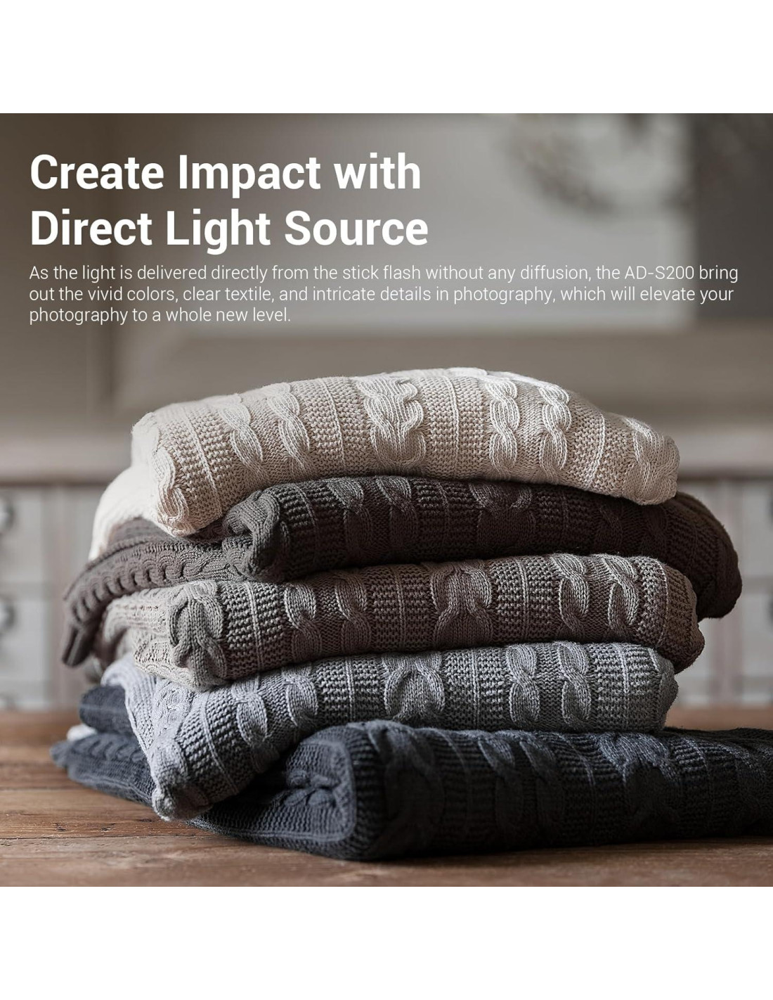 - Colores vívidos y detalles intrincados: Como la luz se entrega directamente desde el flash stick sin ninguna difusión, el AD-S200 resalta los colores vívidos, el textil claro y los detalles intrincados en la fotografía. Entregado a través de un tubo de flash transparente de 360, la fuente de luz cilíndrica es perfecta para iluminar el espacio de disparo, eliminar sombras, revelar detalles, mientras mantiene el impacto creado por el tubo desnudo, lo que elevará tu fotografía a un nuevo nivel.