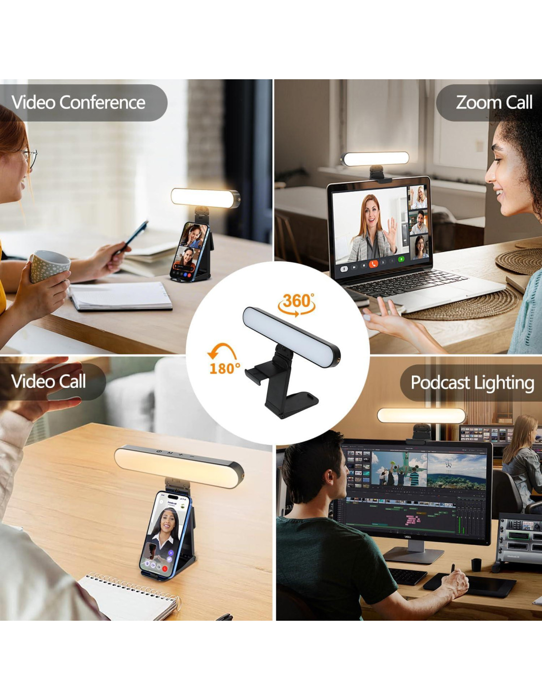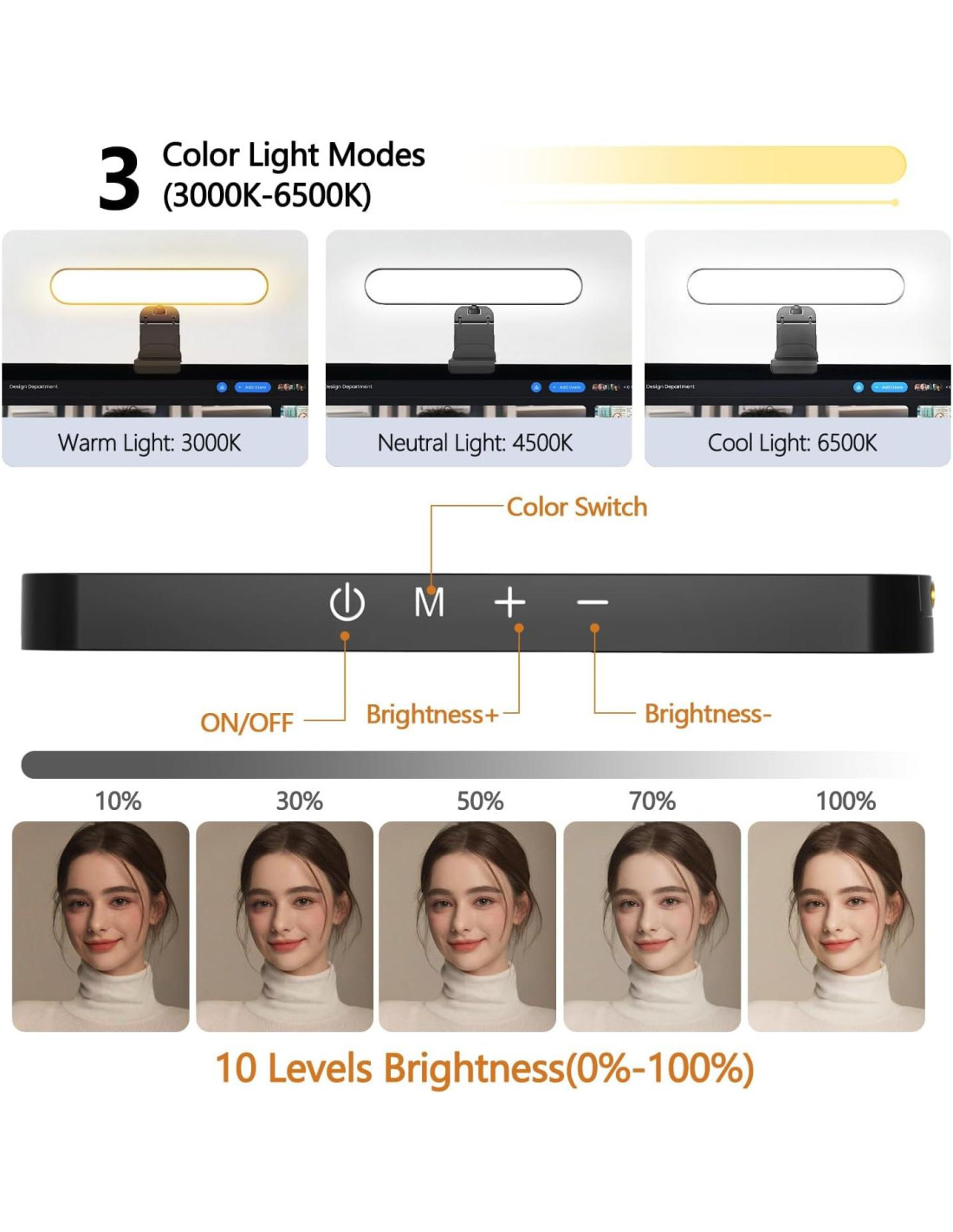 - [3 Modos de Color y 10 Niveles de Brillo] Nuestra luz para computadora portátil para conferencias de video adopta tecnología de protección ocular, la luz es suave y natural. La luz para computadora para reuniones de zoom proporciona 3 modos de color y 10 niveles de brillo, puedes ajustar la luz de video según el entorno. No importa dónde estés, esta iluminación para computadora para conferencias de video puede presentarte perfectamente