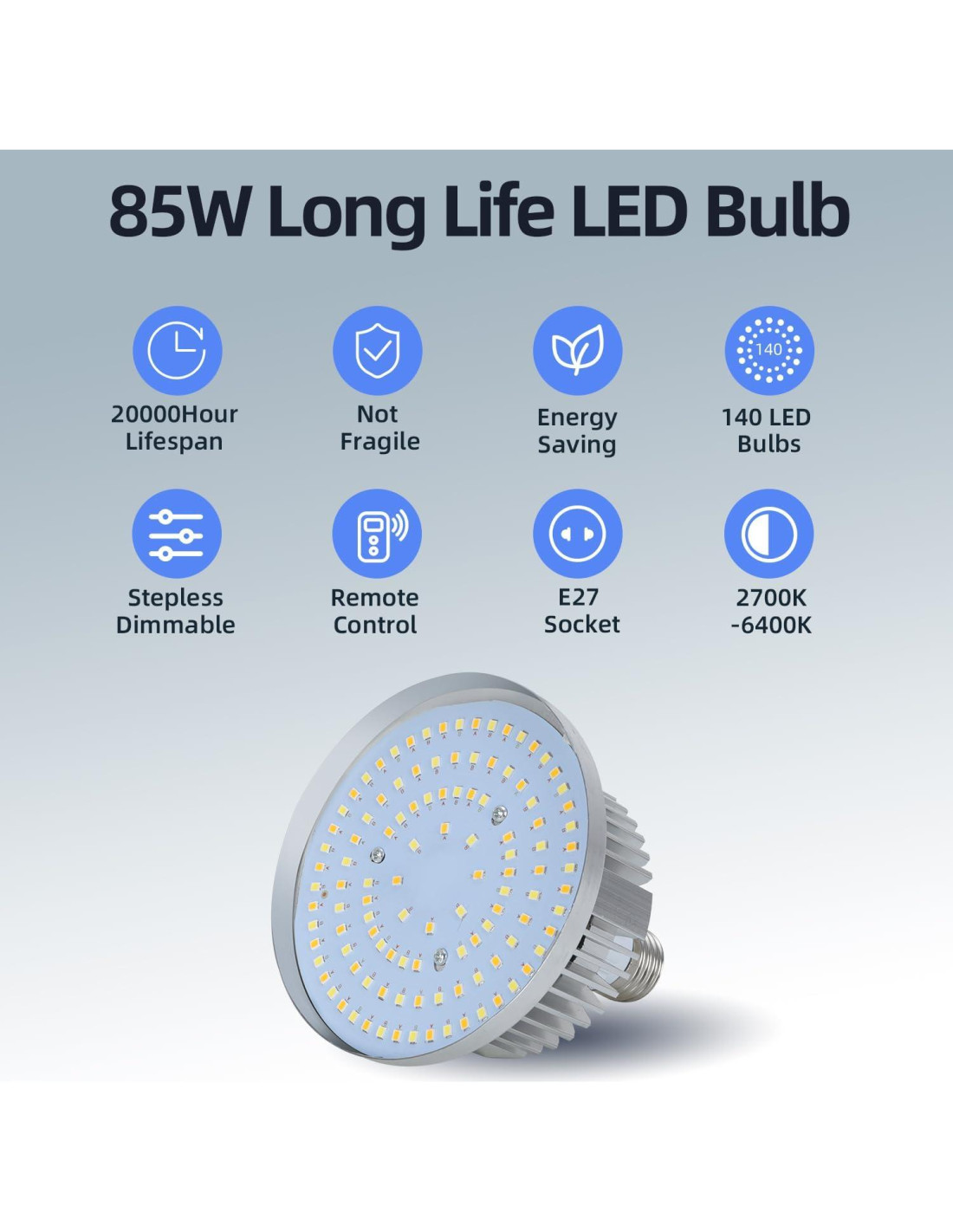 - Bombillas LED Actualizadas: Bombillas LED regulables de 3 colores con difusor incorporado, temperatura de color 2700-6400K y brillo ajustable del 1 al 100% a través del control remoto.