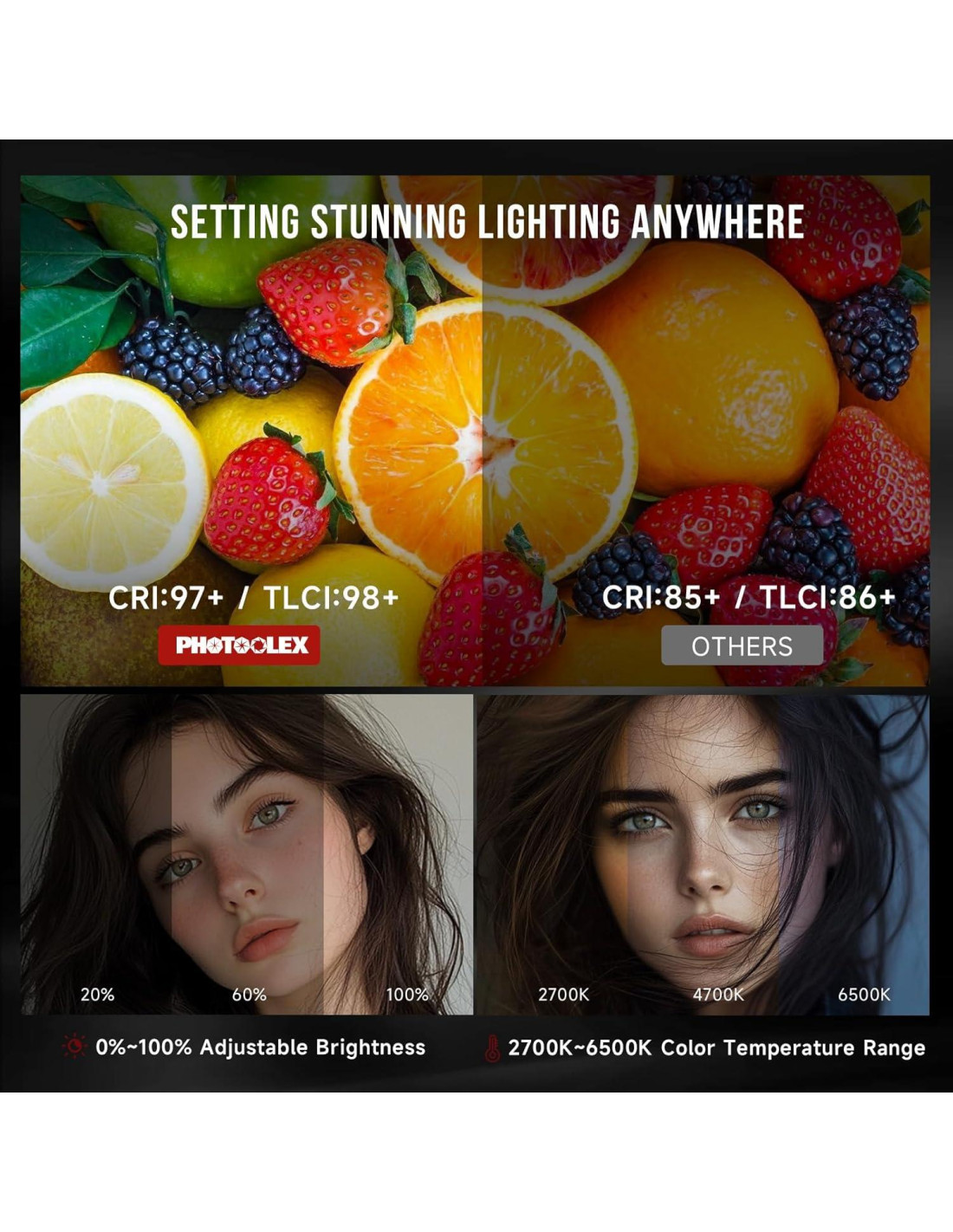 - [Control por Teléfono Móvil y Panel Corporal con Sistema de Enfriamiento Silencioso] La luz LED Q100Lite cuenta con un sistema de control dual, ya sea a través de la pantalla RGB incorporada y botones de control, o control por teléfono móvil a través de la APP PHOTOOLEX. No solo es visualmente atractiva, sino también fácil de operar. Esta luz está equipada con un sistema de enfriamiento inteligente de ahorro de energía, asegurando un rendimiento estable y un toque cómodo.