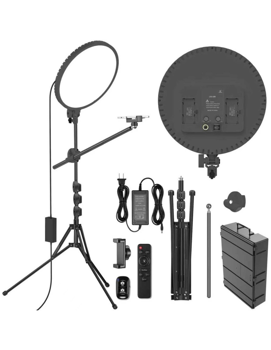 - [Lo que obtienes] - Lista de Empaque: 1*gran anillo de luz, 1* soporte de trípode para anillo de luz, 1* controlador de luz, 1* control remoto inalámbrico, 1* Soporte para Teléfono Rotatable 360, 1* adaptador de corriente, 1* Instrucciones, 1* caja de plástico de alta resistencia (para viaje y protección del conjunto de lámparas).