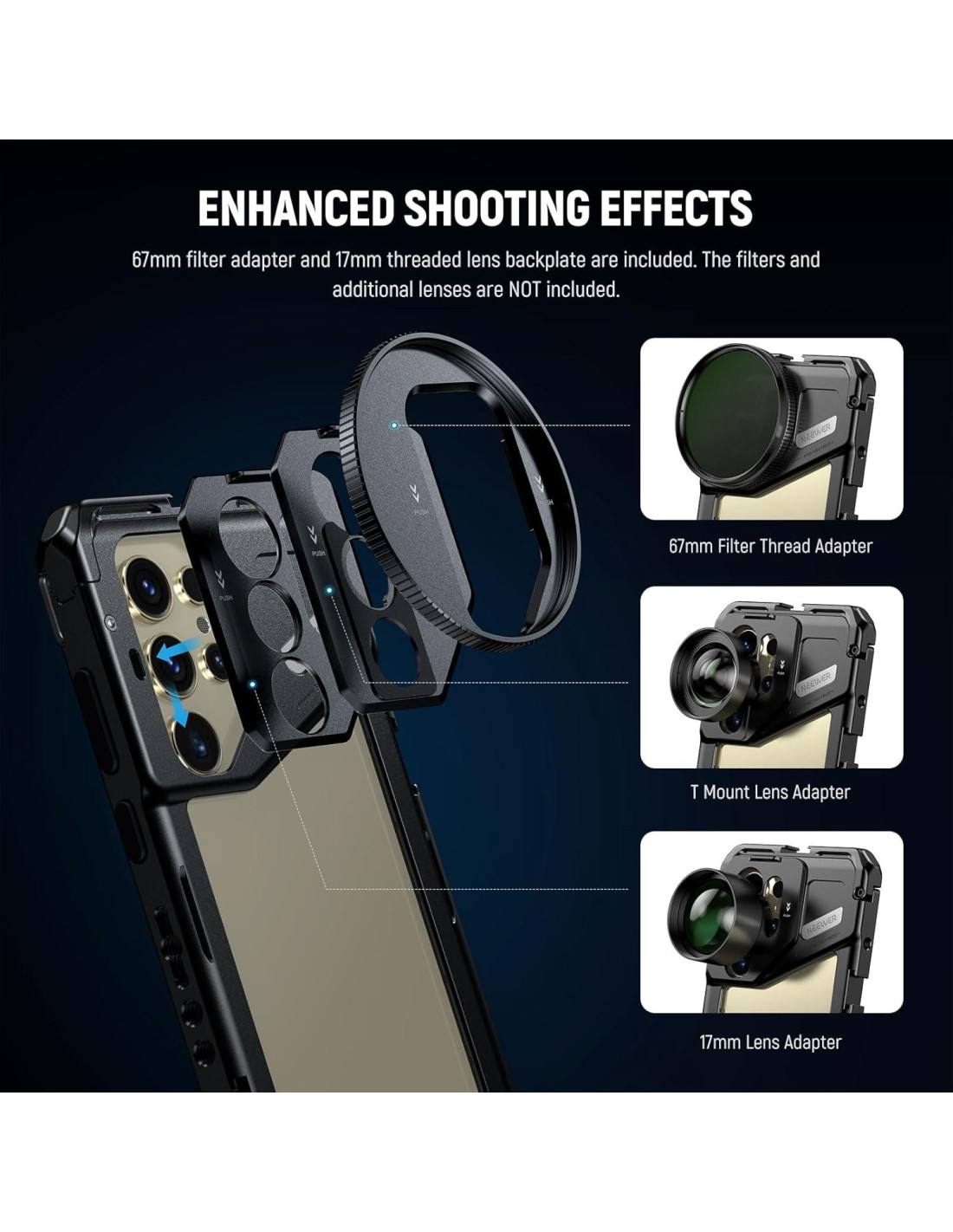 - [Compatible con Galaxy S24 Ultra] Diseñado para Samsung Galaxy S24 Ultra, este duradero kit de soporte de video para teléfono de aleación de aluminio cuenta con una rosca de filtro de 67 mm, una placa de respaldo de lente de rosca de 17 mm y una placa de respaldo de lente de montura T para grabación de video, vlogging, streaming en vivo de YouTube/TikTok, fotografía y videografía móvil, producción de películas. Ideal para creadores de contenido en redes sociales, influencers, creadores de videos, cineastas, youtubers, vloggers, etc.