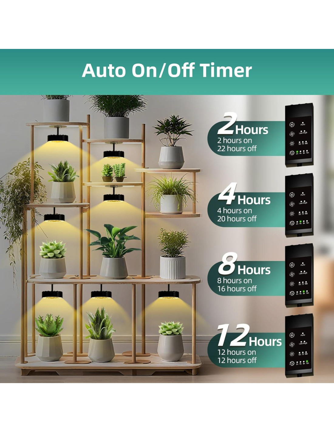 - MODO INTELIGENTE DE UN TOQUE: El modo automático analiza los datos de crecimiento de las plantas a través de IA. Cuando la luz de la planta activa el modo automático, se ajusta a las mejores condiciones de crecimiento para la mayoría de las plantas, proporcionando 12 horas de luz suplementaria y flujo de aire para salvar plantas atrofiadas y acelerar el crecimiento.