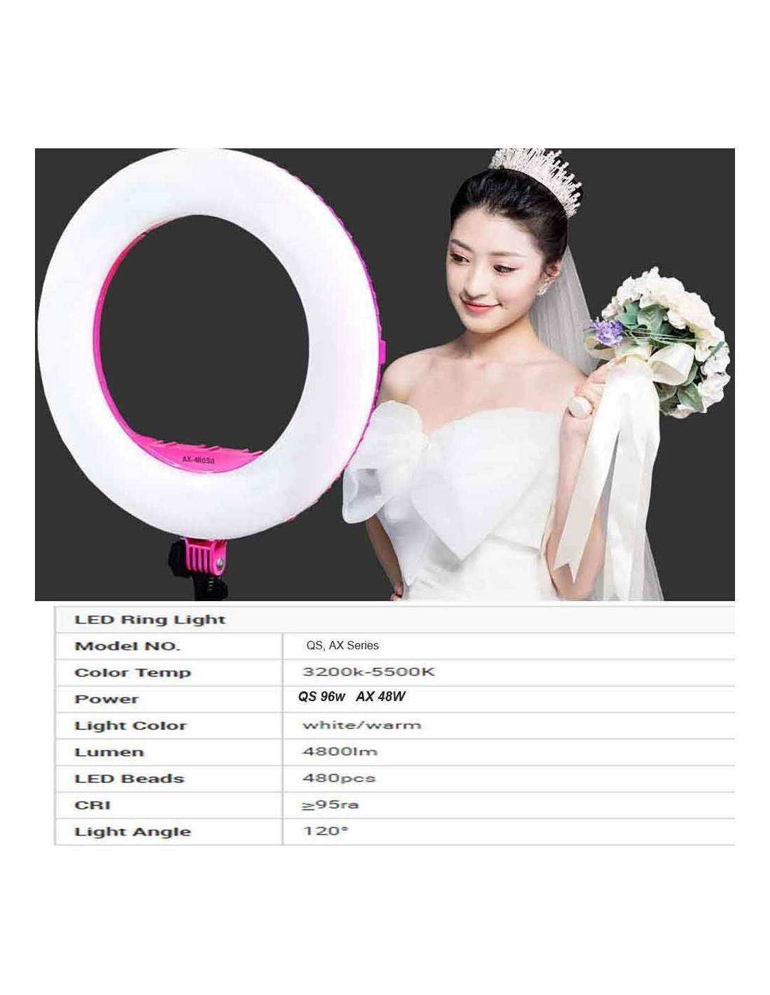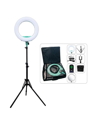 La serie AX está compuesta por chips LED SMD de alta luminosidad, la vida útil es de hasta 50,000 horas. Esta serie es más eficiente y ahorra energía, incluso puede alcanzar el menor nivel de pérdida de luz. Funciona con adaptador de CA (110V-220V). Rango de temperatura de color ajustable de 3200-5500K. La serie AX es adecuada para grabaciones al aire libre. Fotografía de personajes y bodas, iluminación para maquillaje y estudios. Descripciones: 1) Luz de anillo LED, CRI más alto: más de 95RA, regulable 10%-100%, sin parpadeo 2) Diseño inteligente y compacto, fácil de transportar 3) Adopta tubo LED importado de alta tecnología con más de 50,000 horas de vida útil. 4) Adecuado para fotografía y grabación de video en interiores y exteriores, fotografía de retratos y bodas, entrevistas, etc., especialmente amigable para la fotografía de bebés. 5) Cargador USB, puede ayudar a cargar su teléfono celular mientras lo usa. Especificaciones: Modelo: AX-480EII Temperatura de color: 2800K-5500K+/-200K (Bi-color sin escalas ajustable) Potencia: 48W (240 LEDs) Voltaje: CA 110-220V / CC 15V Lúmenes: 3300 Lux/0.5m, 1000 Lux/1m Índice de reproducción cromática: 95RA Ángulo de luz: 60 grados El paquete incluye: 1x Lámpara de anillo LED 1x Cable de alimentación 1x Adaptador de CA 1x Soporte para teléfono inteligente 1x Espejo de maquillaje 1x Instrucciones 1x Control remoto 1x Trípode de 216 cm (debe comprar todo el conjunto) 1x Bolsa de colgar (debe comprar todo el conjunto)
