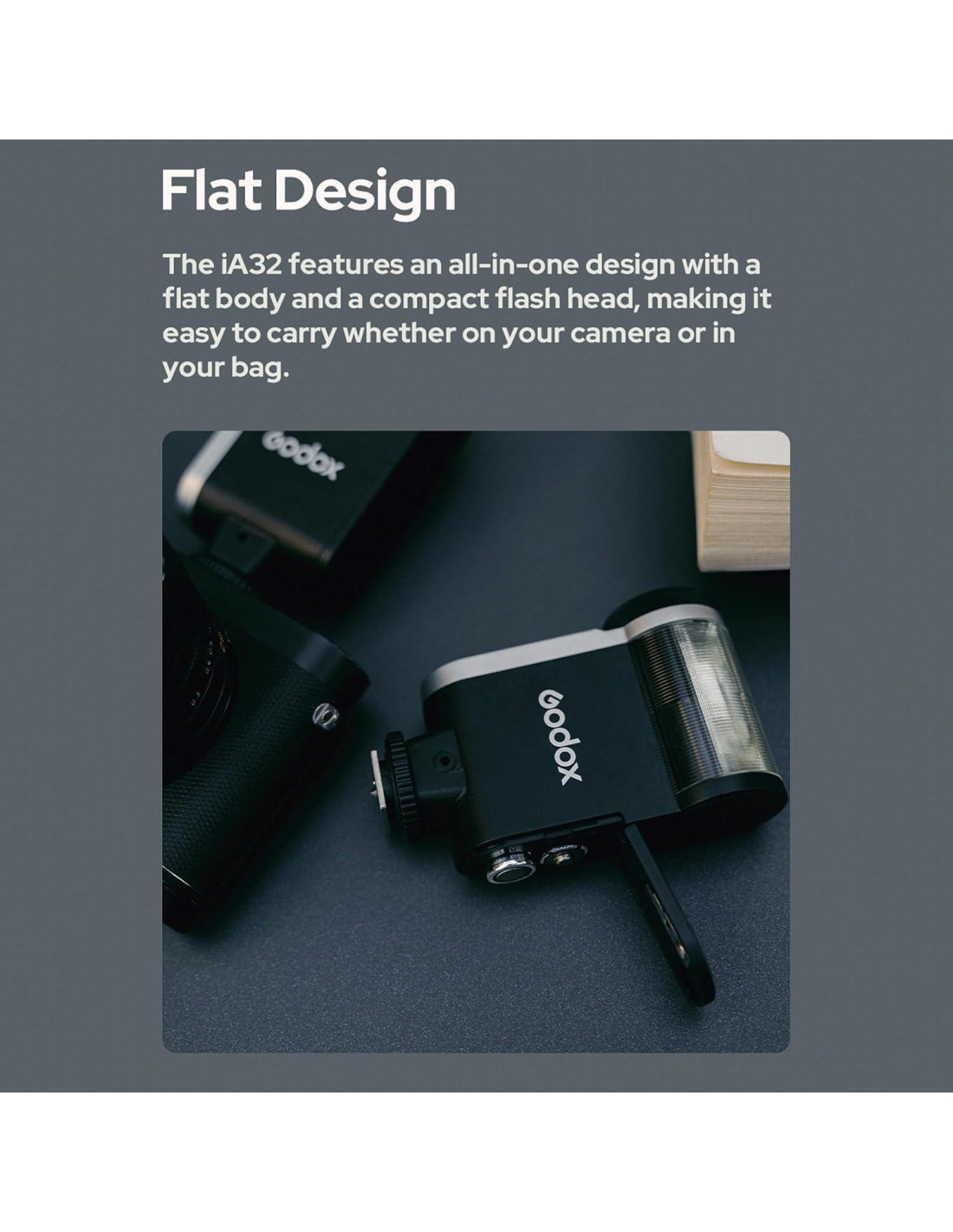- El Godox iA32 es un flash mini compacto y ligero, su tubo de flash ajustable ofrece un rango de rotación de -7 a 90 para un efecto de rebote de flash variado, lo que lo hace perfecto para fotografía de viaje y disparos en la calle diarios