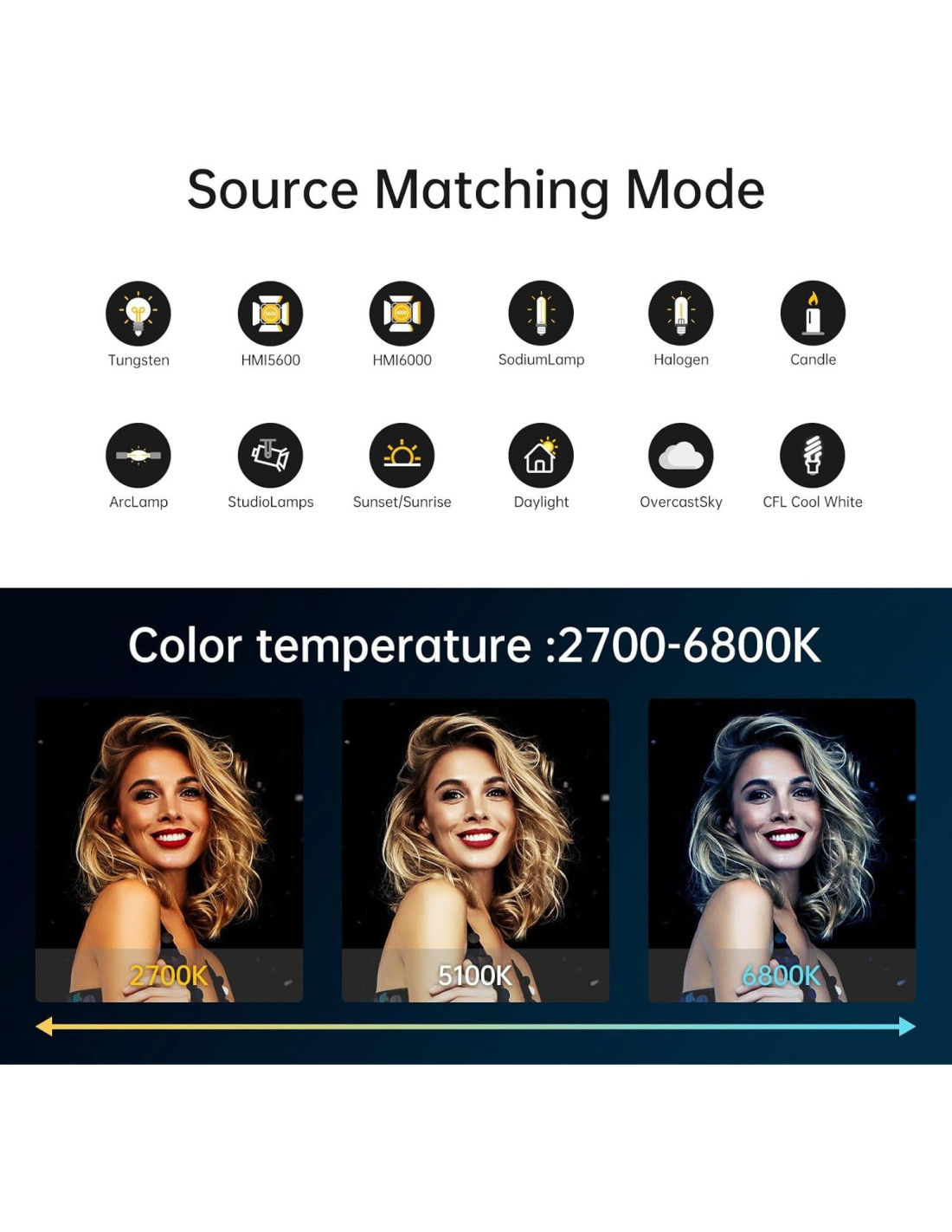 - Potentes Perlas de Lámpara LED: Las perlas de lámpara LED de 200W crean una fuente de luz estable e iluminación uniforme, asegurando un alto brillo. Al ajustar la temperatura de color y el color de varias perlas de lámpara, también calculará automáticamente la potencia adecuada para mantener la potencia de diferentes temperaturas de color y colores consistente. Mantiene el brillo constante mientras ajusta la temperatura de color.