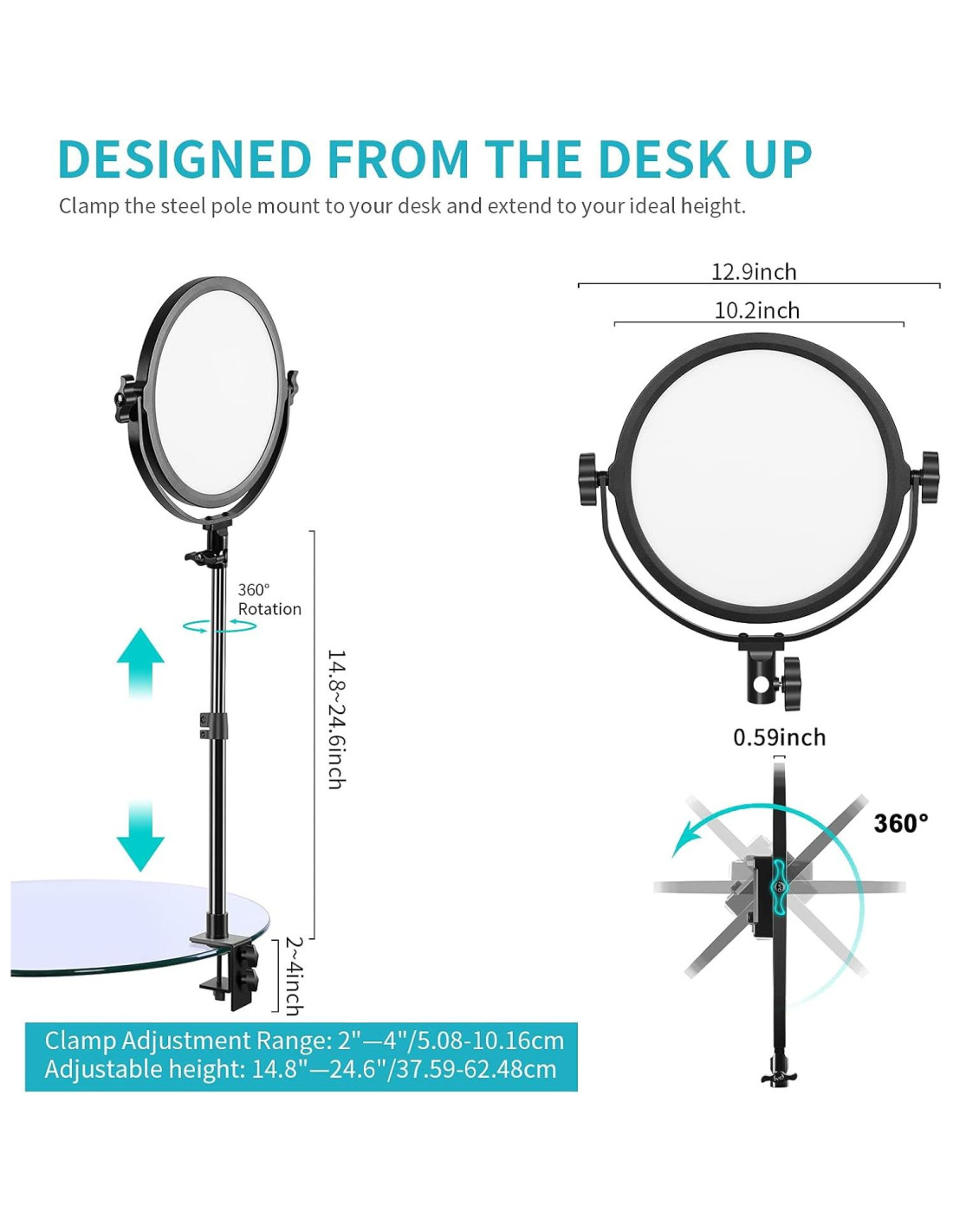 - [Una Luz Clave Compacta de Soporte de Escritorio] Con un sólido C-clamp de metal (se adapta a un grosor de 5-10 cm), ajustable (37.4 cm - 62.5 cm) y soporte robusto, libremente 360 grados a cualquier ángulo, la luz de streaming GVM siempre mantendrá tu lugar de trabajo ordenado y perfecto.