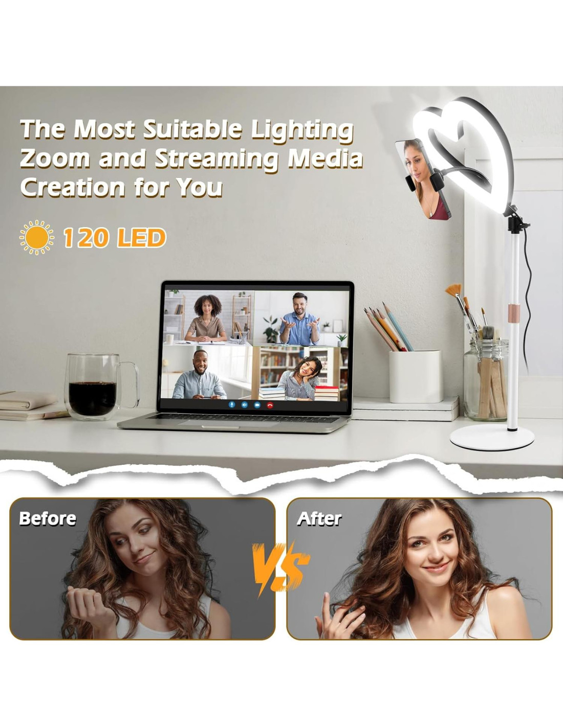 - Diseño en Forma de Corazón con 47 Colores RGB: Agrega un toque de elegancia a tu configuración con nuestra única luz de anillo en forma de corazón, que presenta 47 colores RGB vibrantes para infinitas posibilidades creativas.