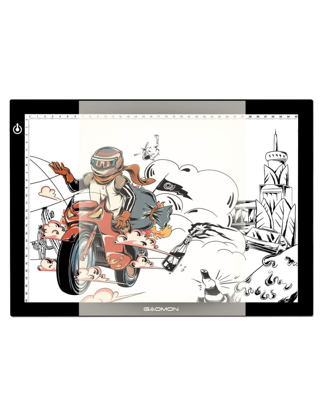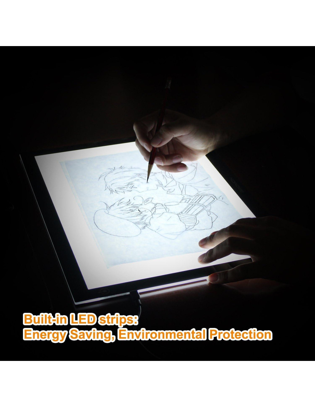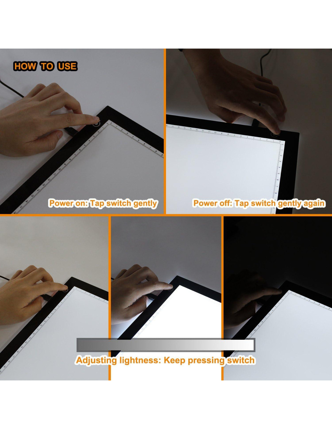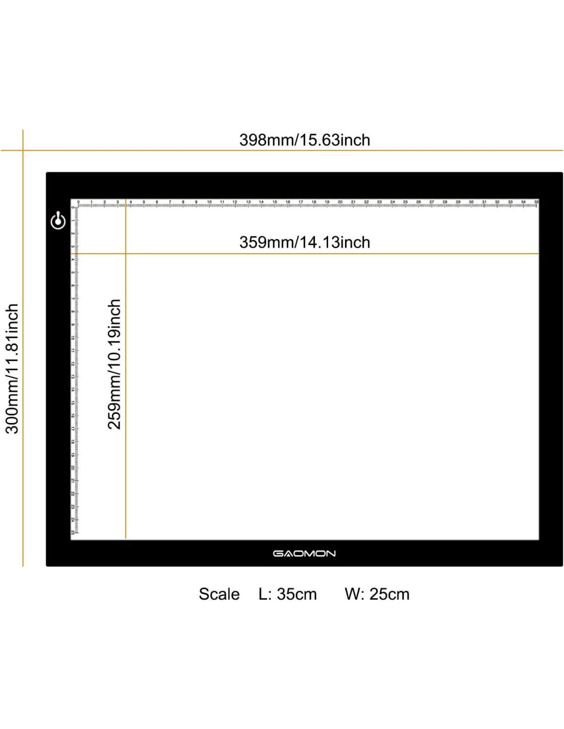 - (ULTRAFINA Y DISEÑO LIGERO) --- Grosor: 5mm / Peso: 0.34 KG, ligera y elegante, la almohadilla de luz es portátil y se puede almacenar fácilmente; Tamaño moderado --- Diagonal: 19.59 pulgadas (49.78cm) / Escala: 35 x 25 cm / Área iluminada: 14.13 x 10.19 pulgadas (359mm x 259mm) / Dimensiones: 15.63 x 11.81 x 0.2 pulgadas (398 x 300 x 5.15 mm). Más grande que el tamaño A4, adecuado para calcos, transferencia de tatuajes, caligrafía y más.